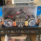 This 1:10 scale diecast model of Jesse James' West Coast Choppers "Sturgis Special" is a must-have for any motorcycle enthusiast. With its vibrant red color and detailed design, this model captures the essence of the iconic bike. The model is made of high-quality die cast metal and is recommended for ages 15 and up. The Sturgis Special model is part of the West Coast Choppers series by Muscle Machines, and features authentic details such as the Jesse James theme and the year of manufacture, 2004. Whether you're a collector or simply appreciate the beauty of motorcycles, this model is sure to impress.