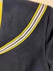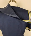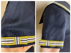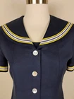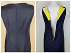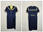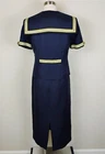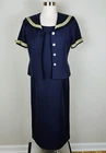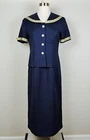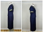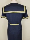 Gorgeous two piece outfit in a fun, nautical style features a midi/maxi length sleeveless shift dress with a matching button front jacket. The dress is long length and either midi or maxi depending on your height. The dress is a solid navy but the interior yoke lining is bright yellow. The rest of the dress has a navy lining. Back vent, hidden back zipper. The jacket brings all the fun to this outfit. The navy blue jacket sports a large sailor collar. The collar, short sleeves, and back belt all feature a blue, white and yellow trim. The short sleeves even have small bows in the matching trim. Jacket is button front and the large buttons are iridescent in abalone. Jacket also has two v shaped front vents and shoulder pads. Linen blend fabric insures a comfortable and breathable fit. SIZE: 6P (Petite) Vintage item so please check measurements for fit. COLOR: Blue MATERIAL CONTENT: Self 55% linen, 45% rayon / Lining 100% polyester STYLE: Dress/Jacket CARE: Dry Clean COO: China CONDITION: Excellent pre-owned condition with no fading, stains, pilling, or holes/tears. There is a slight fabric blemish on left sleeve where it appears a bit lighter than surrounding fabric. Please see photos for details. FLAT MEASUREMENTS (approximate) DRESS Underarm to Underarm: 18" Shoulder to Hem: 46.5" Waist: 17" Hip: 20" JACKET: Underarm to Underarm: 19" Shoulder to Hem: 21" Sleeves: 9" If you have any questions, please don’t hesitate to ask. Thanks for viewing our listing! Nautical, seashore, sailor, Navy, Easter, church, wedding, breathable, old money