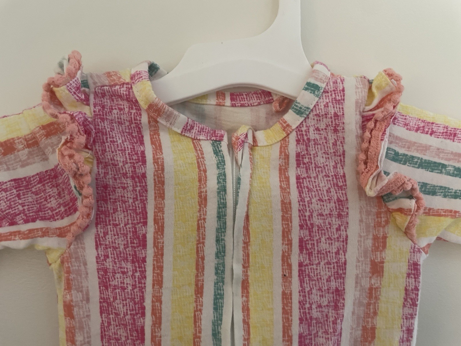 Occasion: Casual Accents: Ruffle Character Family: Rainbow Features: Comfort, Easy Care, Lightweight, Pockets, Stretch Size: 3-6 Months Sleeve Length: Long Sleeve Brand: Jessica Simpson Seller Notes: “In very good condition. Free of rips or stains.” Department: Girls Number of Pieces: 1 Piece Season: Fall, Spring, Summer, Winter Garment Care: Machine Washable Type: One-Piece Theme: Colorful Color: Multicolor Style: 1-Piece Material: 60% cotton, 40% polyester Pattern: Striped Country of Origin: China Closure: Zip Fabric Type: Blended Fabric