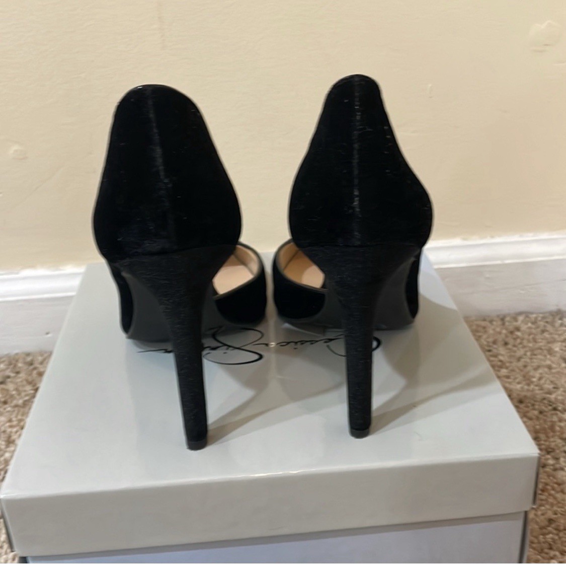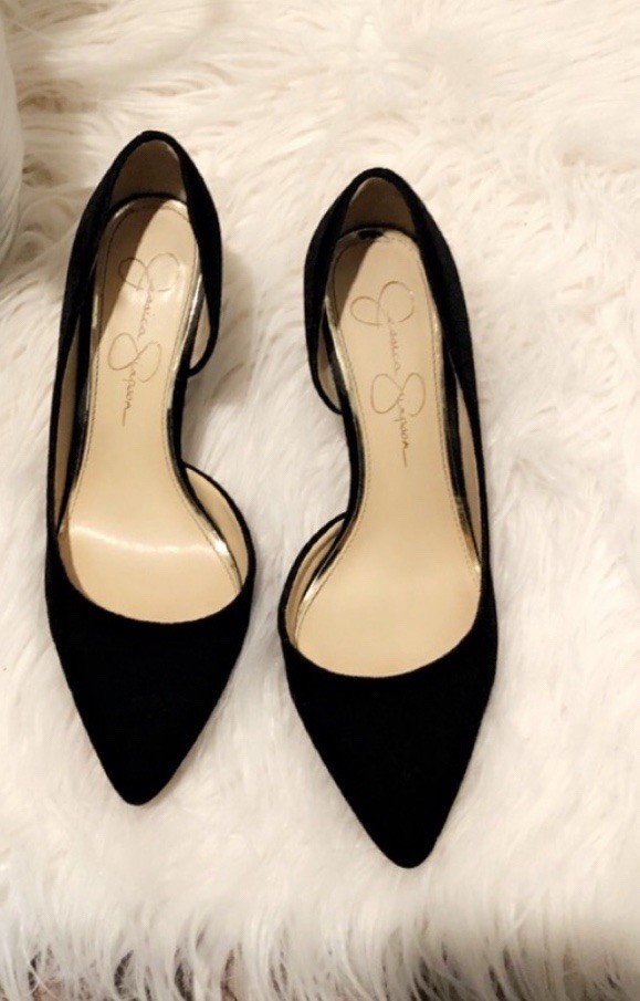 The Jessica Simpson JP Livvy Suede Pumps are stylish stiletto heels perfect for a party or cocktail event. These black pumps feature a pointed toe shape and slip-on closure for easy wear. Made from faux leather and suede, they are designed for the modern woman who loves to make a fashionable statement. The stiletto heel adds a touch of elegance, while the snakeskin pattern adds a unique and trendy twist to the classic pump style. Perfect for summer, fall, or spring, these Jessica Simpson heels are a must-have for any fashion-forward wardrobe.