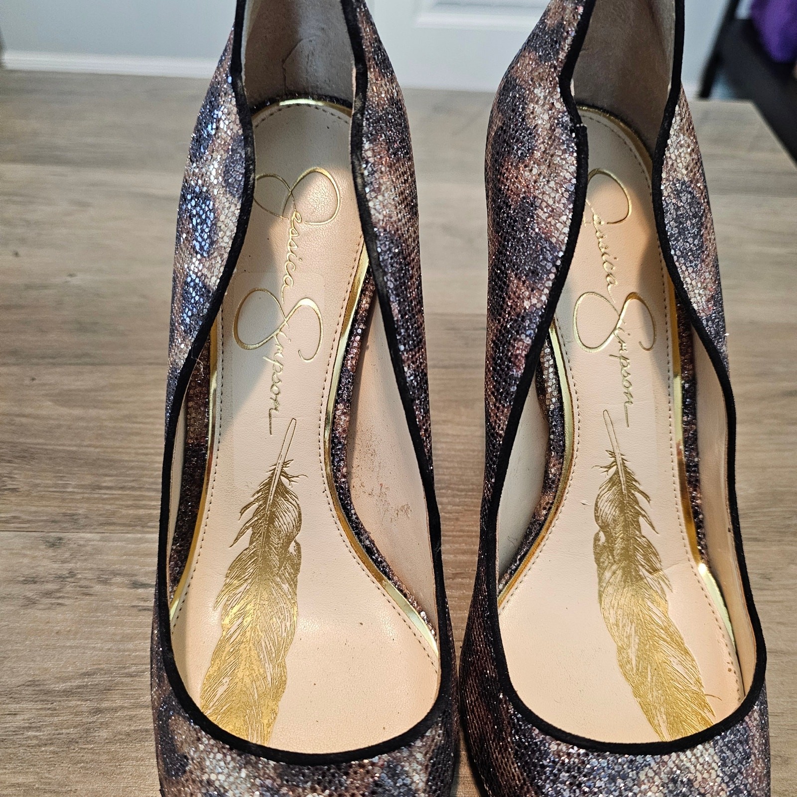 Jessica Simpson Pixy Heels Womens Size 8 Animal Print Shimmer Black Brown Party Great Condition! -Closure: Slip on - 4 inch heel -Color: Brown and black cheetah print with sparkly design all over -Scalloped edges with a pointed toe Measurements in photos. Same day / next day shipping Offers accepted Like for price drops and deals Bundle 2 items or more and save! Thank you! 1lb 3oz