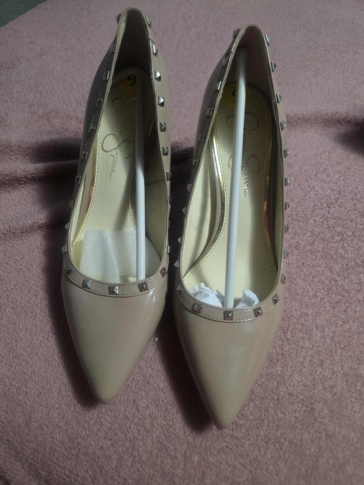 Jessica Simpson Studded Beige Patent Leather Pointed Toe Pumps US 9 Women