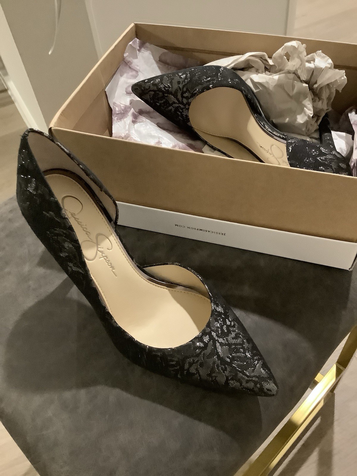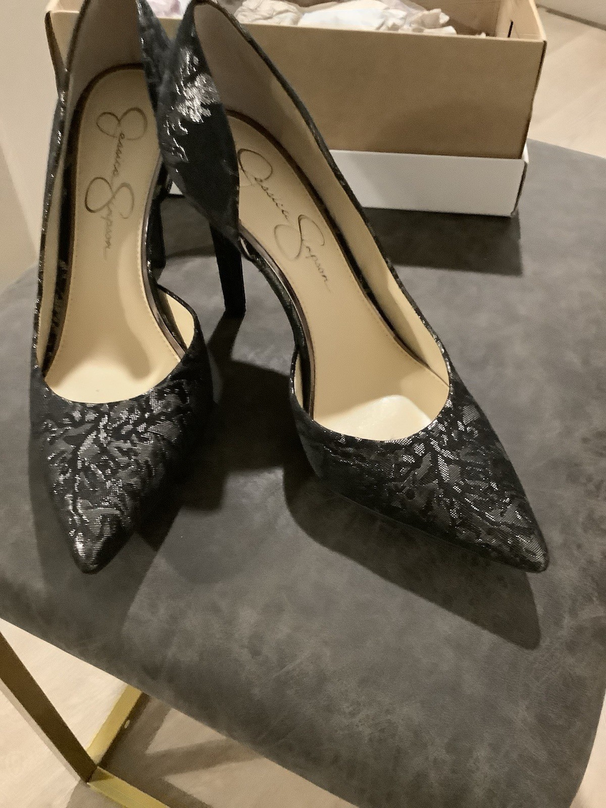 The Jessica Simpson Women's High Heel Pump in Size 8 Pewter Multi Metallic is a stylish and elegant shoe perfect for party or cocktail occasions. This stiletto heel pump features a metallic pewter color with a linen upper material, making it a chic and versatile choice for the summer, fall, and spring seasons. With a brand known for quality, this pump exudes a trendy metal theme and a comfortable M shoe width, making it a must-have addition to any woman's wardrobe.