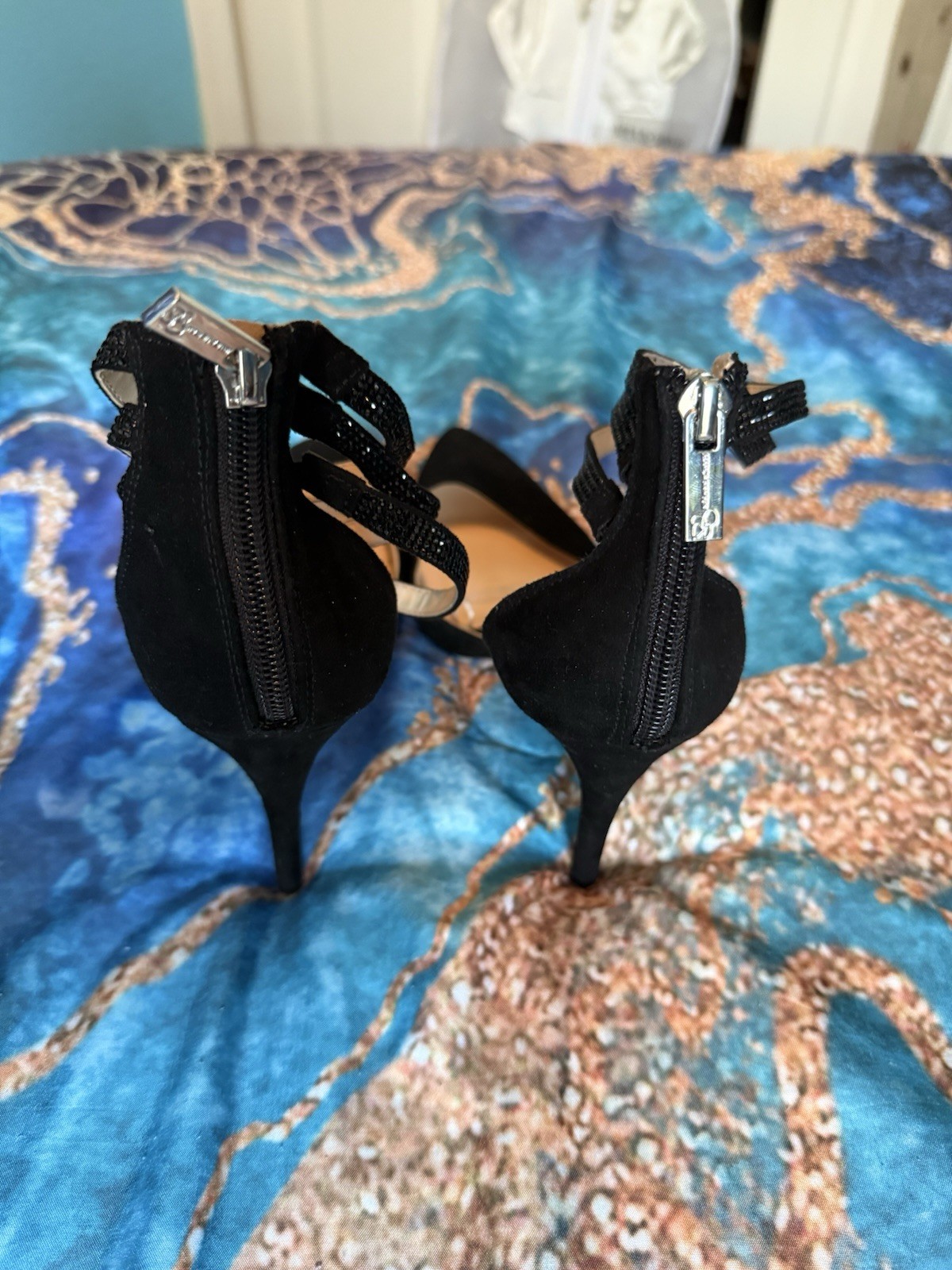 This Jessica Simpson Women's High Heel in size 10 is a stylish and glamorous choice for parties, cocktails, or formal events. The ankle strap adds a touch of elegance to the ultra high stiletto heel, making it a chic and trendy option for the fashion-forward woman. Made with synthetic upper and insole materials, this pump features a sleek black color and accentuates any outfit with its glittery design. Perfect for the summer, fall, or spring seasons, these heels are sure to make a statement with their ultra high heel and ankle strap accents. Look brand new just have a sticker residue but can’t be seen when wearing them.
