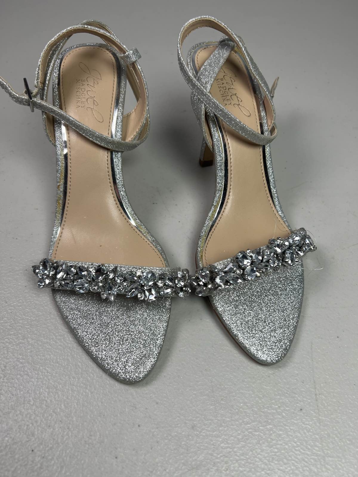 Step into the spotlight with these captivating Jewel Badgley Mischka glitter heels sandals. Designed to add a touch of glamour to any ensemble, these elegant sandals feature an eye-catching glitter finish that shimmers with every step. Wonderful for weddings, formal events, or a dazzling night out, they effortlessly combine sophisticated design with a celebratory sparkle. These stunning heels showcase the signature Jewel Badgley Mischka craftsmanship, known for its attention to detail and exquisite embellishments. The design typically includes a secure ankle strap and a comfortable heel, providing both stability and style for extended wear. The glitter detailing ensures you'll make a memorable impression, reflecting light beautifully from every angle. Presented in very good pre-owned condition, these Jewel Badgley Mischka glitter heels sandals are ready to elevate your footwear collection. Experience the luxury and refined elegance that defines the Badgley Mischka brand with these exquisite sandals, a superb choice for those seeking a radiant and stylish statement piece.