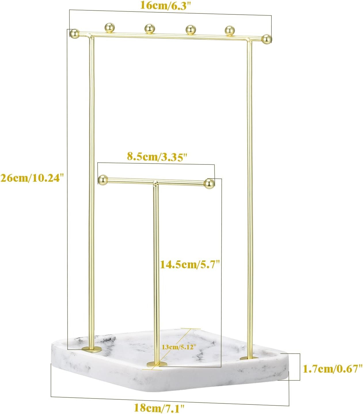 Emibele Jewelry Stand Organizer, 2 Tier Jewelry Holder for Necklace Bracelet Earrings, Jewelry Tree Stand with Gold Metal Rack and White Marble Tray Item Description About this item [2-Tier Jewelry Organizer Stand] The jewelry holder is made of marble pattern ring earring tray and gold rack, with elegant design and simply style are easy to integrated into your home decor. This jewelry storage stand can be used in washbasin, bathroom, vanity countertop, linen closet, bedside table and other places you want. [Sturdy and Durable Jewelry Holder] The rhombus tray is made from high quality resin decorated with marble pattern, and the rods are made from durable metal. With the soft anti-skid mat under the bottom of the product, which can prevent noise and scratching the table when moving. [Tangle-free Necklace Holder] This jewelry stand with 2-tier is designed for quick access to your items. The top rod is perfect for hanging your necklaces. Middle T-bar can hold hair band, bangles, bracelets and watches. Bottom Resin tray can hold hairpins, rings earrings and etc. It is so much easier and faster to see and choose what you want. [Dimensions] Overall size 7.1*5.12*10.91 inches(L*W*H), not too wide or bulky, doesn’t take up too much space on your table and keep everything in one spot neat & organized. Our jewelry holder is easy to install, with the included tool, you can quickly complete the holder in just a few installation steps. [Geat Gift Choice] Elegant style jewelry organizer stand will be a perfect gift for your wife, girlfriend, daughter, mother and women friend in many kinds of festivals, such as Valentine's Day, Mother's day, Thanksgiving, Birthday, Christmas and etc. › See more product details *Features: Simple & Minimalist, Exquisite & Elegant, Functional Organization, Non-slip Pads, Durable & Sturdy, Portable, Perfect as a Gift Hang up your jewelry like earrings, necklaces, rings, bracelets, watches, glasses, etc. Preserve and extend their longevity. Made of solid resin and metal material. Not easy to sway or deform. It will serve for years. Payment safe payment via eBay Shipping Fast and Free Shipping . Return 30 Day's returns