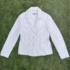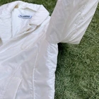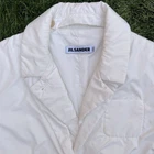 Pre-owned fitted Y2K blazer from Jil Sander Style is a vintage puffer jacket, baby doll crop ultra fitted Windbreak Blazer with Double Collar. Color is white Size 36 Italy sizing (equal to size small in women) Measurements: Pit to Pit 18 inches Length 23.5 inches Arm Length Inseam 18.5 inches Good vintage condition. Pre-worn signs include some light yellowing marks on the polyester fabric in select areas (by the forarms, and by the chest pocket, etc) there aree no major stains or dark marks on these jacket. No snags, holes or tears. All of the seams are in goods condition, no rub marks or fraying. Buttons are intact and functional. Jim Sanders in a luxury designer brand that retails in the $1000’s consistently for their outerwear. This super rare and hard to finds early 2000’s fitted blazer is one of the most unique Y2K pieces on the market. Made like a wind resistant puffer jacket, yet features a collared blazer look, curvy hems with a flare out hip. This blazer is meant to hit above the hip line, in classic y2k design. Think Paris Hilton, Pamela Anderson, One Tree Hill and Gilmore Girls inspiration for this one of a kind piece.