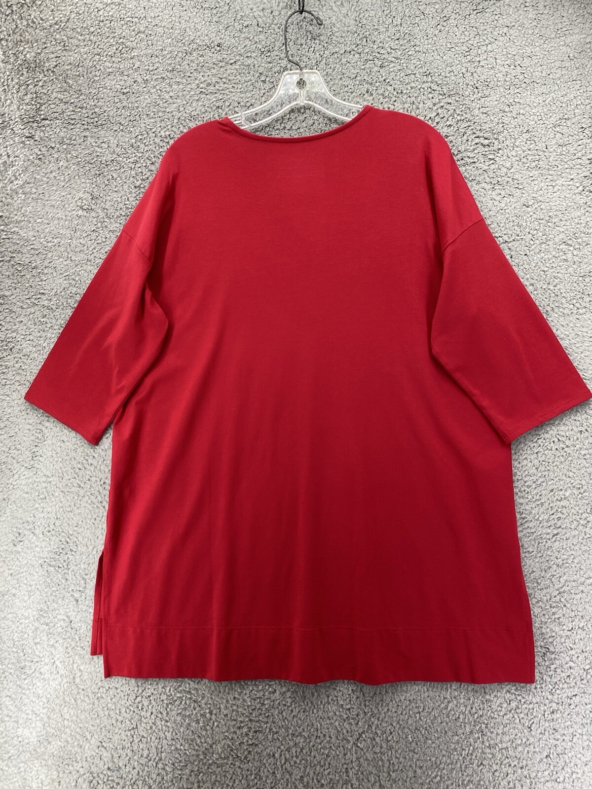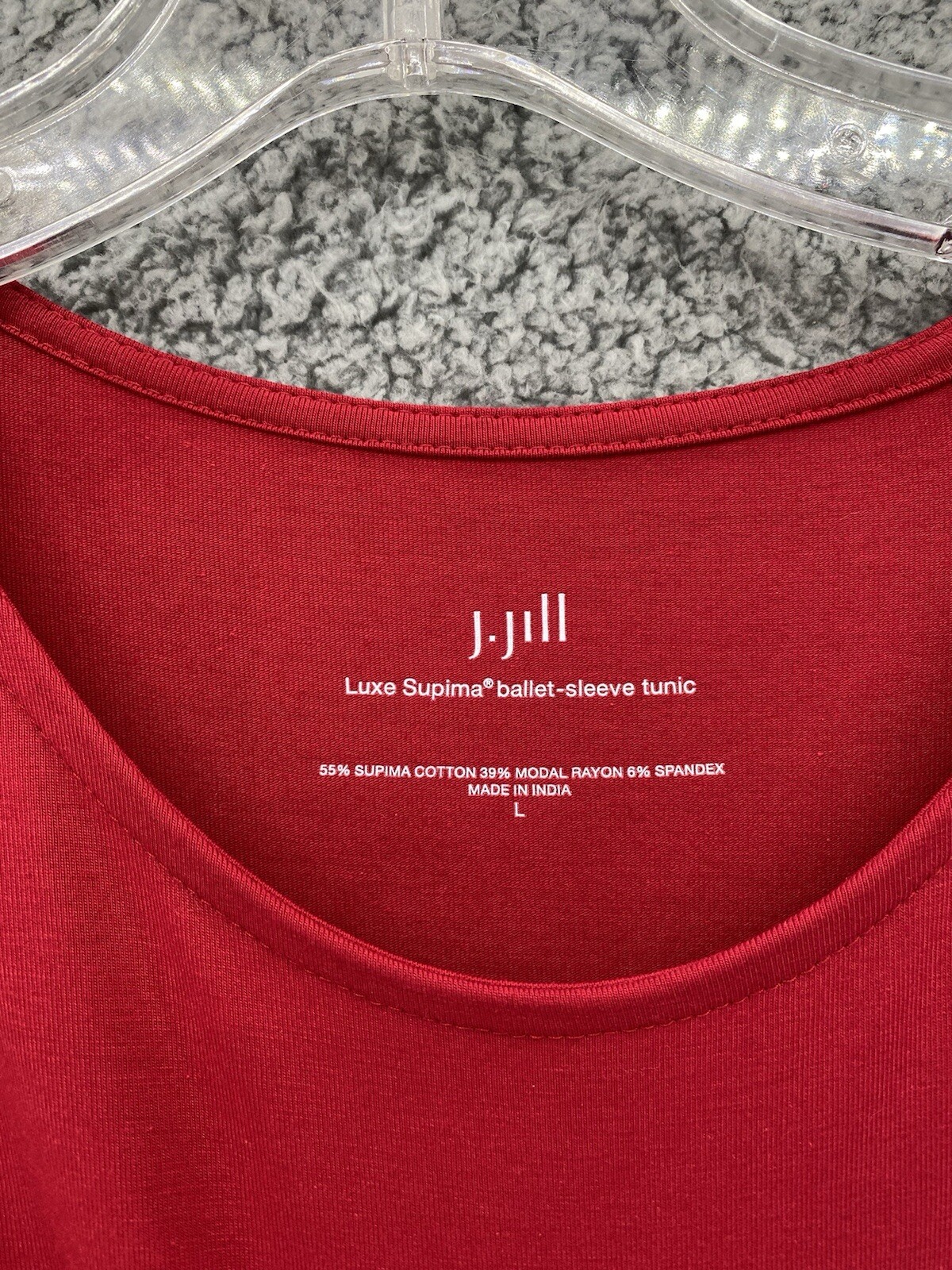 This J. Jill top is a luxurious tunic style shirt in size L, featuring a classic round neck and 3/4 sleeves with a ballet-inspired design. Made from a blend of Spandex, Cotton, and Modal in a solid red color, the top offers a comfortable stretchy fit suitable for all seasons. The pullover closure and collarless neckline add to its modern and casual appeal, making it a versatile piece for any wardrobe.