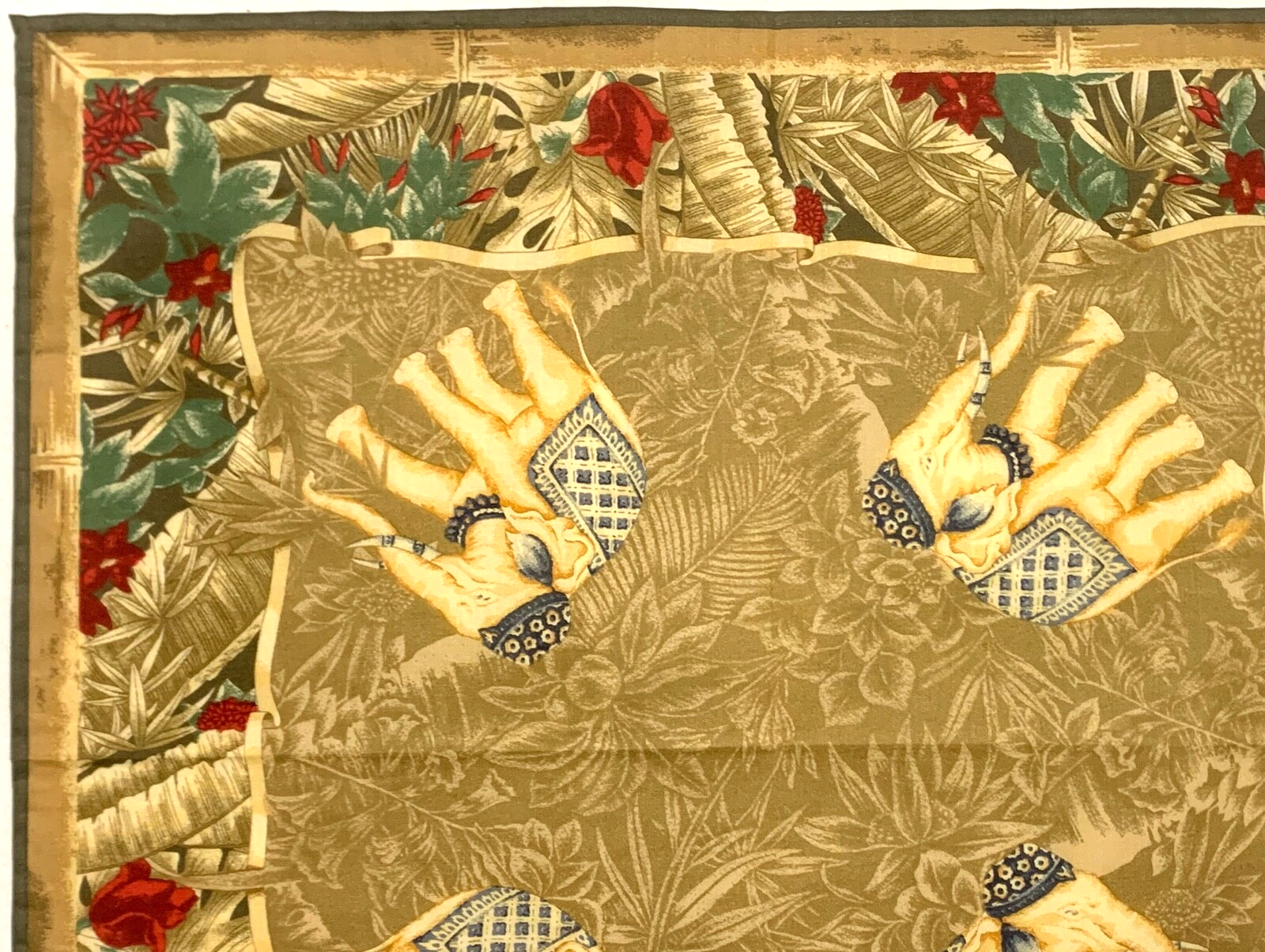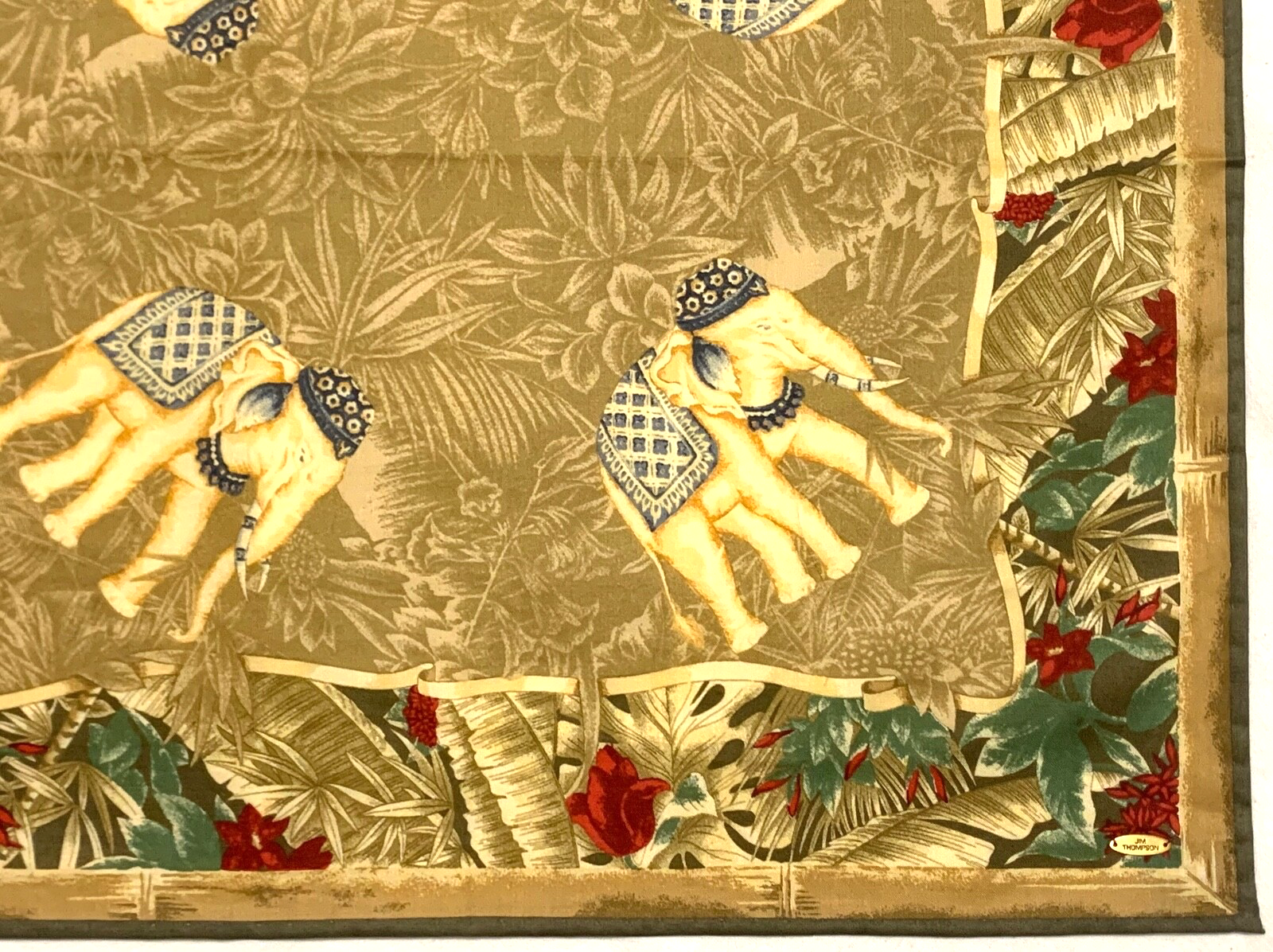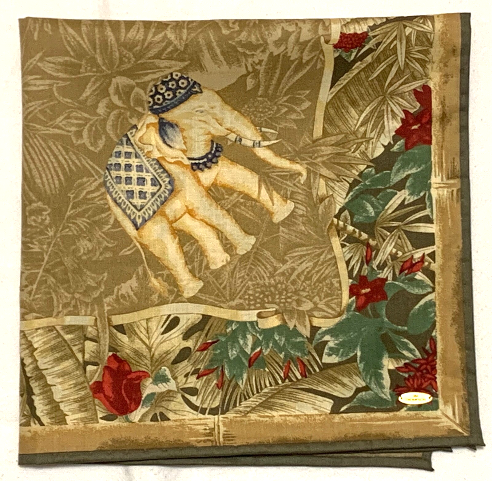JIM THOMPSON Designer ELEPHANT Green Beige Red Cotton 15" Small Scarf Bandana JIM THOMPSON Designer ELEPHANT Green Beige Red Cotton 15" Small Scarf Bandana Click image to enlarge Description A heritage-rich and charming accessory — perfect as a neckerchief or pocket square. This beautifully detailed square scarf by renowned Thai silk house Jim Thompson features a regal elephant motif set against a lush jungle background , bordered with botanical florals in hues of earthy green, red, beige, and navy blue . Made from pure soft cotton , it has a gentle hand-feel and is ideal as a bandana, hair wrap, or pocket square . Finished with hand-rolled edges , and marked with a metal corner tag and cloth label: “Pure Cotton – Made in Thailand.” Size: Approx. 14.5" x 15" Material: 100% Soft Cotton Edges: Hand Rolled Tags: Metal tag: Jim Thompson ; cloth tag: Pure Cotton, Made in Thailand Excellent used condition – no damage, stains, or discoloration 🌟 Browse my shop for more collectible Thai textiles and small-format scarves — I combine shipping on multiples!🌟 Payment The payment term is three days after purchasing the item. Shipping Your item will be shiped by International Priority Mail. I'm always happy to combine shipping, the final shipping cost depends on weight. The extra shipping price is 1.5$ for each additional scarf. The return is free in case of not as described item and the shipping fee is shared if the buyer simply change hers/his mind. About Us Most of the listed items are preloved and they may not be perfect. If there are any major flaws they are mentioned in the description above. All the items are cleaned and come from a pet free and smoke free house. Please take a moment to browse all my listed items; there are variety of scarves in different styles, colors and designers. The handling time is 1 business day. Five stars positive feedback is highly appreciated. In case you are not satisfied please contact me before leaving feedback to solve the problem. Thank you for looking & bidding! Track Page Views With Auctiva's Counter