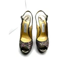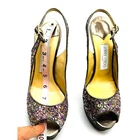 Jimmy Choo CLUE Glitter Gold Slingback Platform Open Toe Sandals in size 39.5 are a stunning pair of statement heels, perfect for special occasions. In great condition, has a bit of discoloration on the Inner heel and the buckle looks a little wonky( this does not affect the shoe at all!) please see pictures !! No major flaws ! These sandals feature a glittery gold fabric upper, adding a luxurious shimmer to every step. The peep-toe design offers a chic and feminine touch, while the slingback strap with an adjustable buckle ensures a secure and comfortable fit. The platform sole provides added height and balance, complementing the high stiletto heel for an elegant silhouette. Crafted with Jimmy Choo’s signature craftsmanship, these heels effortlessly blend glamour and sophistication, making them a timeless addition to any wardrobe. Measurements are approximate . It may be helpful to compare these product measurements to a similar piece you already own. tags: fall, autumn, winter, cool weather, boho, bohemian, mini, tiered, ruffle, fit & flare, long sleeve, date night, night out, event, evening, special occasion, cocktail, dinner, career, business, work, workwear, professional, fashion, fashionable, trendy, wedding, bride, trendsetter, ootd