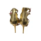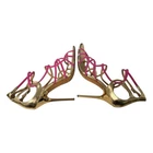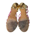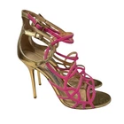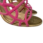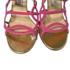 Jimmy Choo Gladiator Suede Strappy Stiletto Heels IT36 Gold Pink Made in Italy Condition: Pre-Owned Markings and Wear on Pink Uppers Scratching and Markings on Insoles Minor Scratching on Heels Wrinkling on Gold Leather Soles Have Signs of Wear All photos are of the actual item you will receive (stock photos aren't used) Your purchase will ship promptly. *e14 Striking and glamorous heels from Jimmy Choo, designed to turn heads and elevate any ensemble. These stiletto heels feature a captivating strappy design with vibrant pink suede straps interwoven against a lustrous gold-toned backdrop. A unique heel cutout and buckle fastening ankle strap add a touch of modern sophistication. Perfect for a special occasion, a night out, or adding a bold statement to your everyday style. Style: Strappy Department: Women Upper Material: Suede Heel Style: Stiletto Theme: Dance, Night Out, Luxury Fashion, Barbiecore Type: Heel Toe Shape: Open Toe Heel Height: 4" Pattern: Solid Closure: Buckle IT Shoe Size: 36 Features: Ankle Strap Keywords: Jimmy Choo heels, gold heels, pink heels, strappy heels, stiletto heels, designer heels, size IT36, size US6, party heels, evening heels, special occasion shoes, buckle heels, suede heels, women's heels