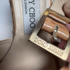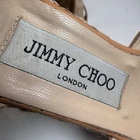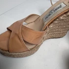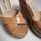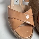 Elegant Jimmy Choo patent leather espadrille wedge sandals in a nude–peach shade. Designed with crossover straps, jute-wrapped platform wedges, and adjustable ankle buckle. A chic and timeless style that works perfectly for summer outfits, vacations, or dressy warm-weather looks. Features: • Patent leather upper • Nude peach color • Crossover front straps • Jute espadrille wedge • Adjustable ankle strap • Jimmy Choo logo buckle A beautiful statement wedge with the iconic Jimmy Choo aesthetic.