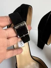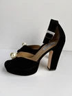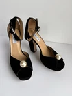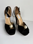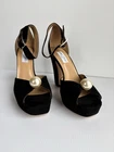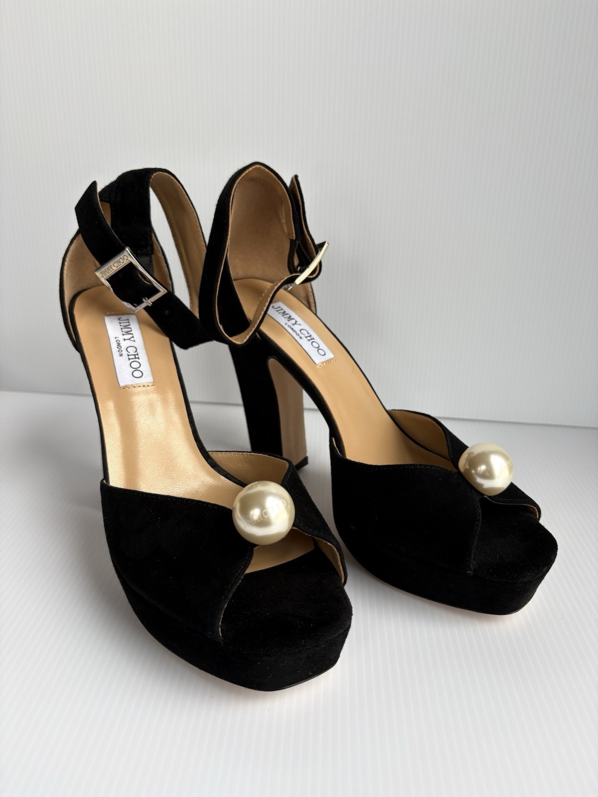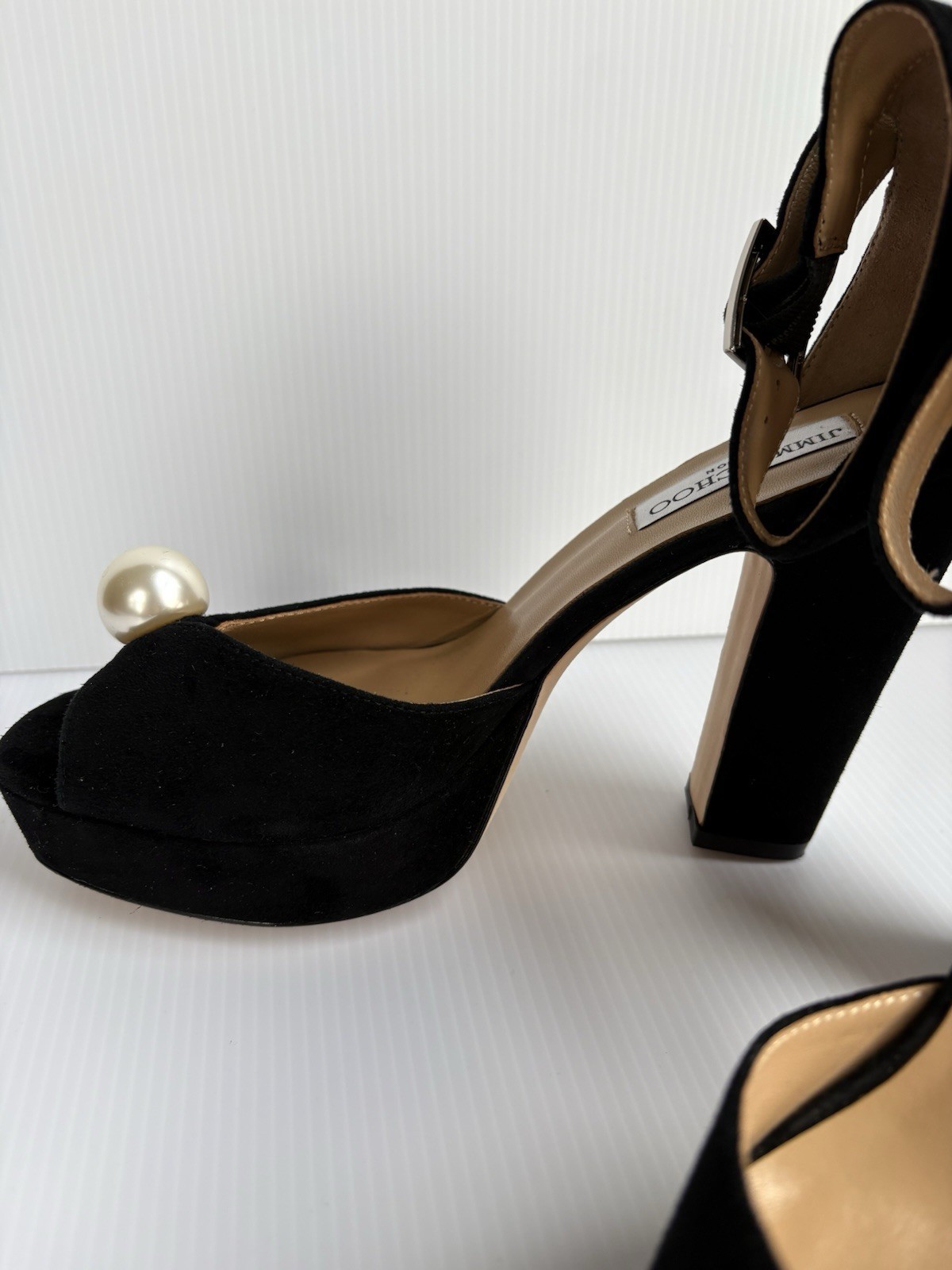 Jimmy Choo Socorie 120 faux pearl-embellished suede platform sandals in black. They feature a 120mm heel and a 25mm platform Size 8 Platform Pearl Block heel 4” Ankle strap with buckle closure Made in Italy Size EU 38 Like new Heels