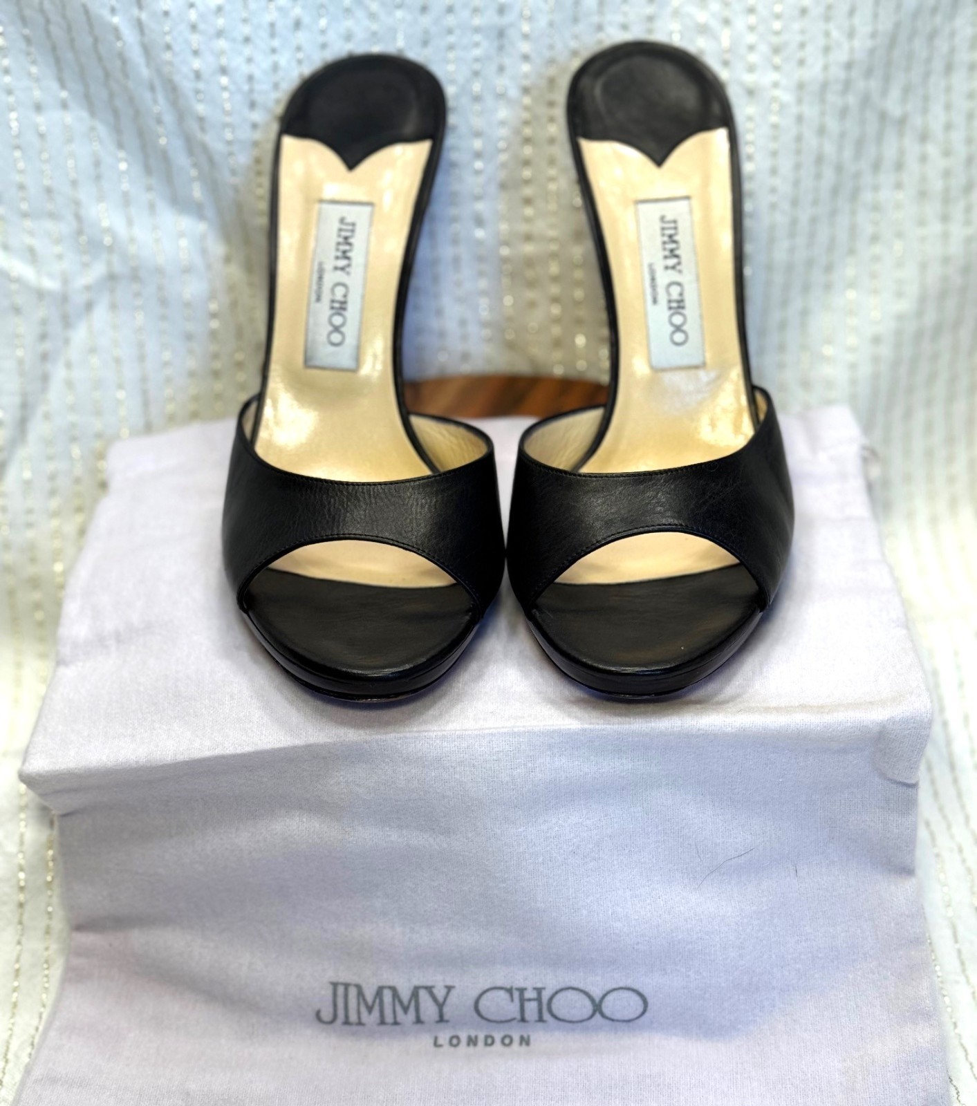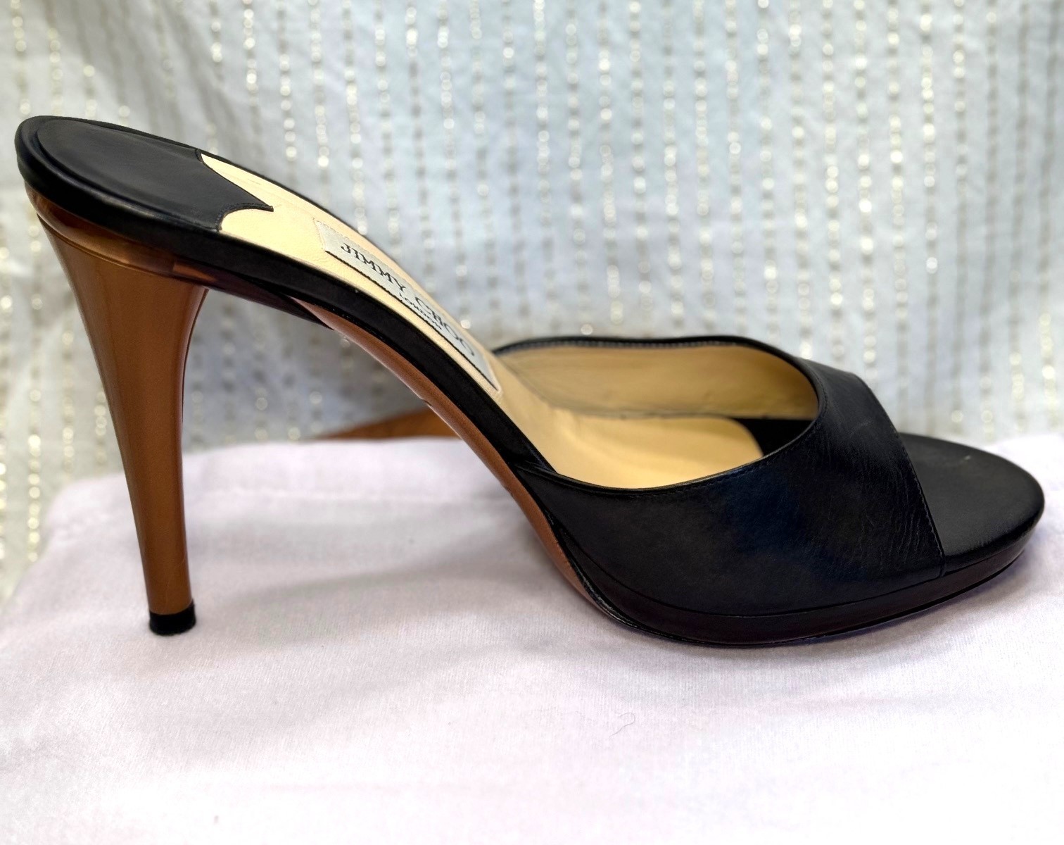 Authentic Jimmy Choo black soft leather mules with high heels of 4.5” and platform 0.5”. Heel is bronze color. Fashioned in a subtly slouchy silhouette, these Jimmy Choo slides are crafted in a classic black leather body with a frontal strap. They are set on a tapering block heel and balanced with a low platform sole making it a comfortable pair for longer days.