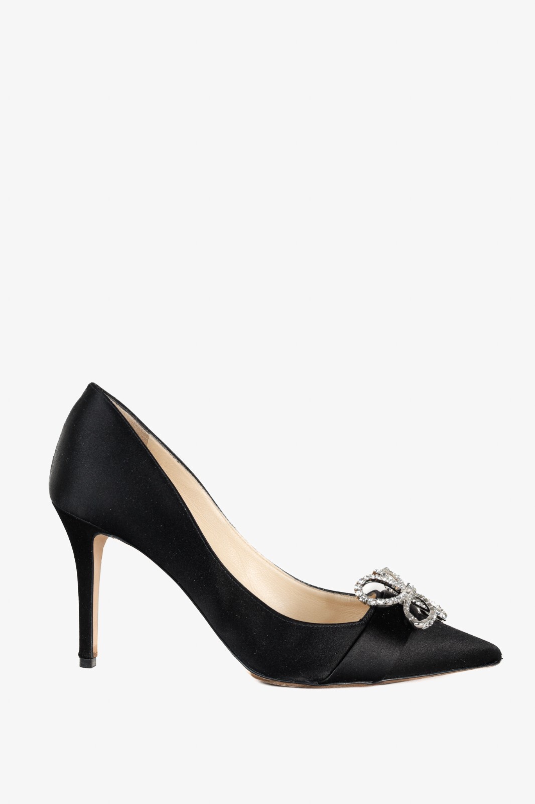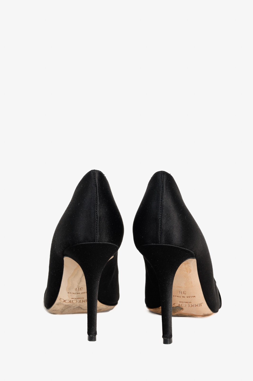 Circa 2016, the Veil 85 pumps from Jimmy Choo are crafted in a black satin, and are embellished with crystal bows on the vamps. They feature covered stiletto heels, closed pointed toes, and leather lining and soles. Size: 38 (US 7.5) Condition: Excellent; very light marking on upper, very light scratching on toes, light signs of wear on insoles, moderate wear on outsoles. Comes with dustbag and box. Approximate Measurements: Insole Length: 9.5” (24 cm) Heel Height: 3.5” (9 cm) Composition: Satin upper, crystal embellishments, leather lining and soles.