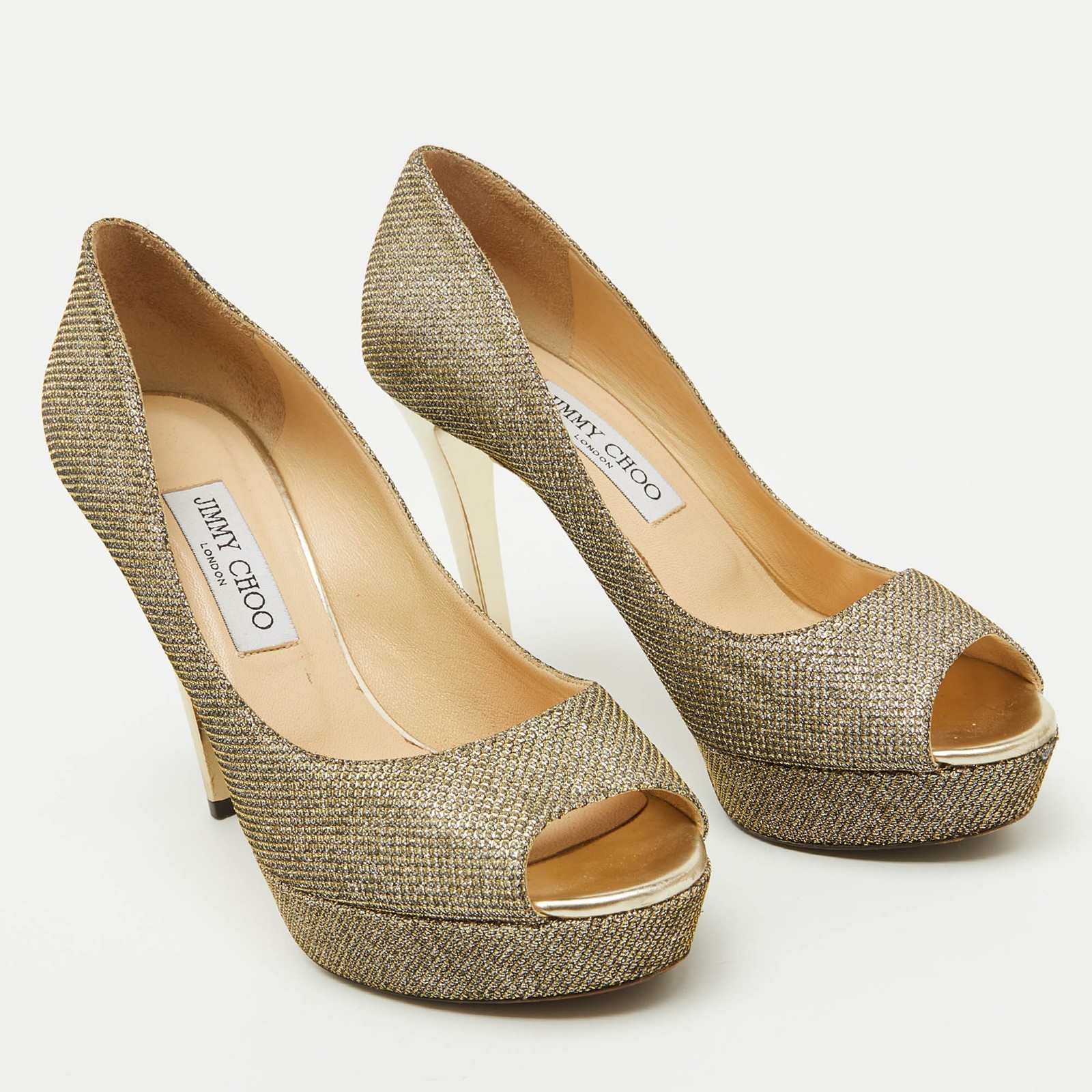 Make a chic style statement with these designer pumps. They showcase sturdy heels and durable soles, perfect for your fashionable outingsCertified by The Luxury Closet - This item has gone through a detailed authentication process overseen by our experts. We offer a lifetime guarantee of authenticity on all our items. Import duties, taxes and charges are not included in the item price. These charges are the buyers responsibility. Please check with your country’s customs office to determine what these additional cost will be prior to buying. Our eBay Store About Us Contact Us Add to Favorite Sellers Jimmy Choo Metallic Gold Lurex Fabric Peep Toe Platform Pumps Size 39.5 $188.1 Make a chic style statement with these designer pumps. They showcase sturdy heels and durable soles, perfect for your fashionable outings Product Details Brand Color Gold Dimensions Material Metallic Lurex Fabric Size 39.5 Outsole Width 6.5 cm Outsole Length 24.5 cm Heel Height 11.5 cm Includes The Luxury Closet Packaging Certified by The Luxury Closet This item has gone through a detailed authentication process overseen by our experts. We offer a lifetime guarantee of authenticity on all our items. How We Check The in-house team of experts at The Luxury Closet is highly trained to verify the authenticity and the condition of the luxury products. They ensure that only 100% authentic items are put on sale.The evaluation process is unique with its own mix of assessment criteria and differs according to the category. Each item is evaluated based on the following combination of hallmarks, hardware, stitching, symmetry, material, craftsmanship, stamping, codes, hologram stickers, and packaging. Our authenticators also check if the items have been modified or amended (e.g., aftermarket diamonds, replaced batteries, repaired bags, etc.) International Buyers Import duties, taxes and charges are not included in the item price. These charges are the buyers responsibility. Please check with your country’s customs office to determine what these additional cost will be prior to buying.