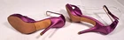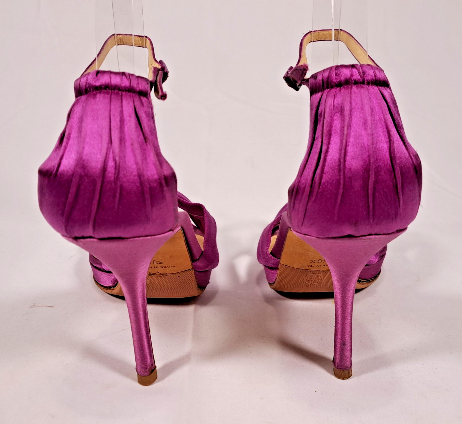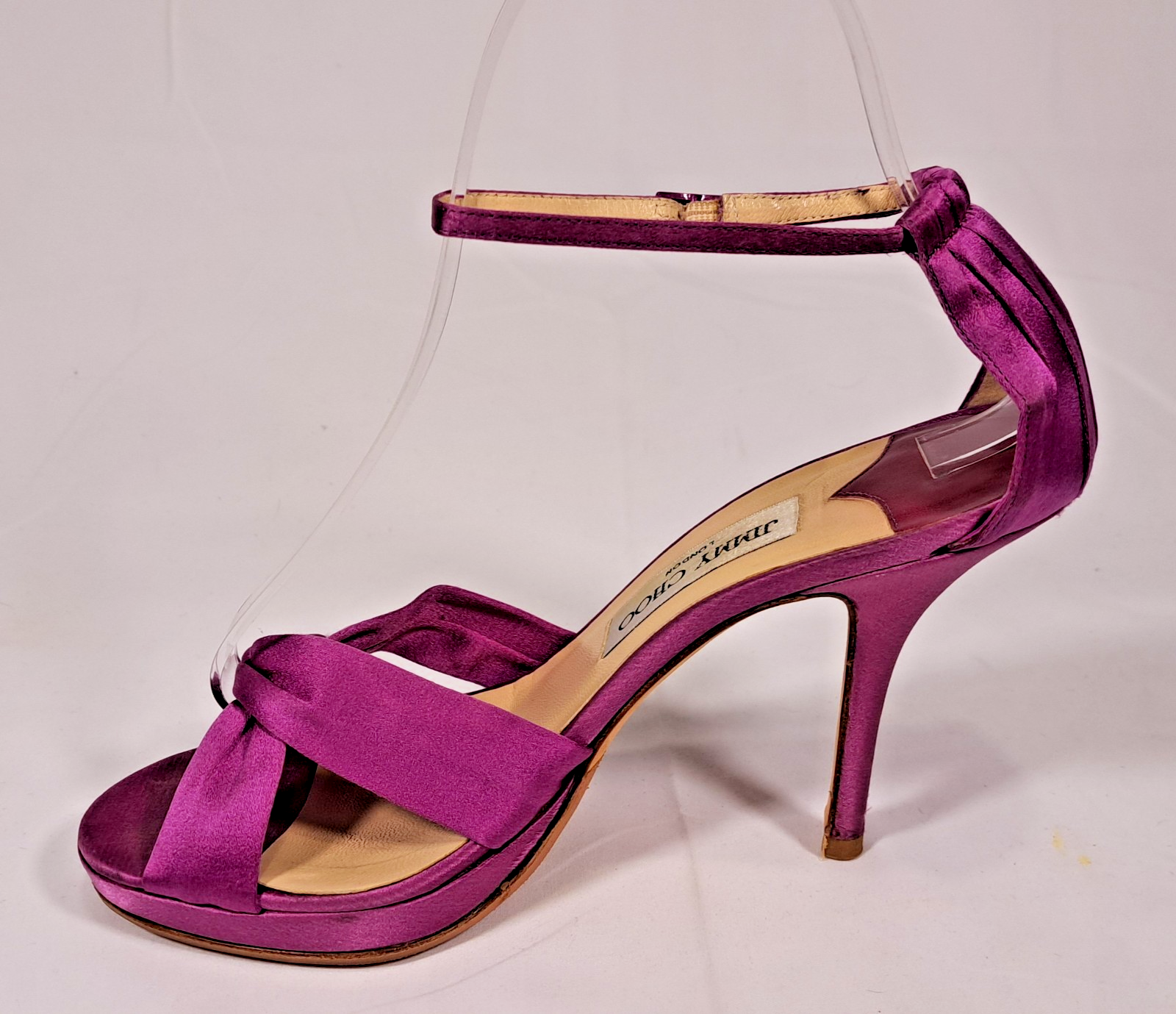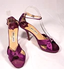 The product is a pair of ultra-high heels from the brand Jimmy Choo, featuring a strappy design with an open toe and a buckle closure. The shoes are made of purple satin with a platform height of 1 inch and a heel height of over 4 inches. These stylish heels are designed for women in a size 8.5 US, and are perfect for adding a pop of color and elegance to any outfit.