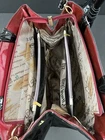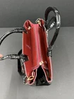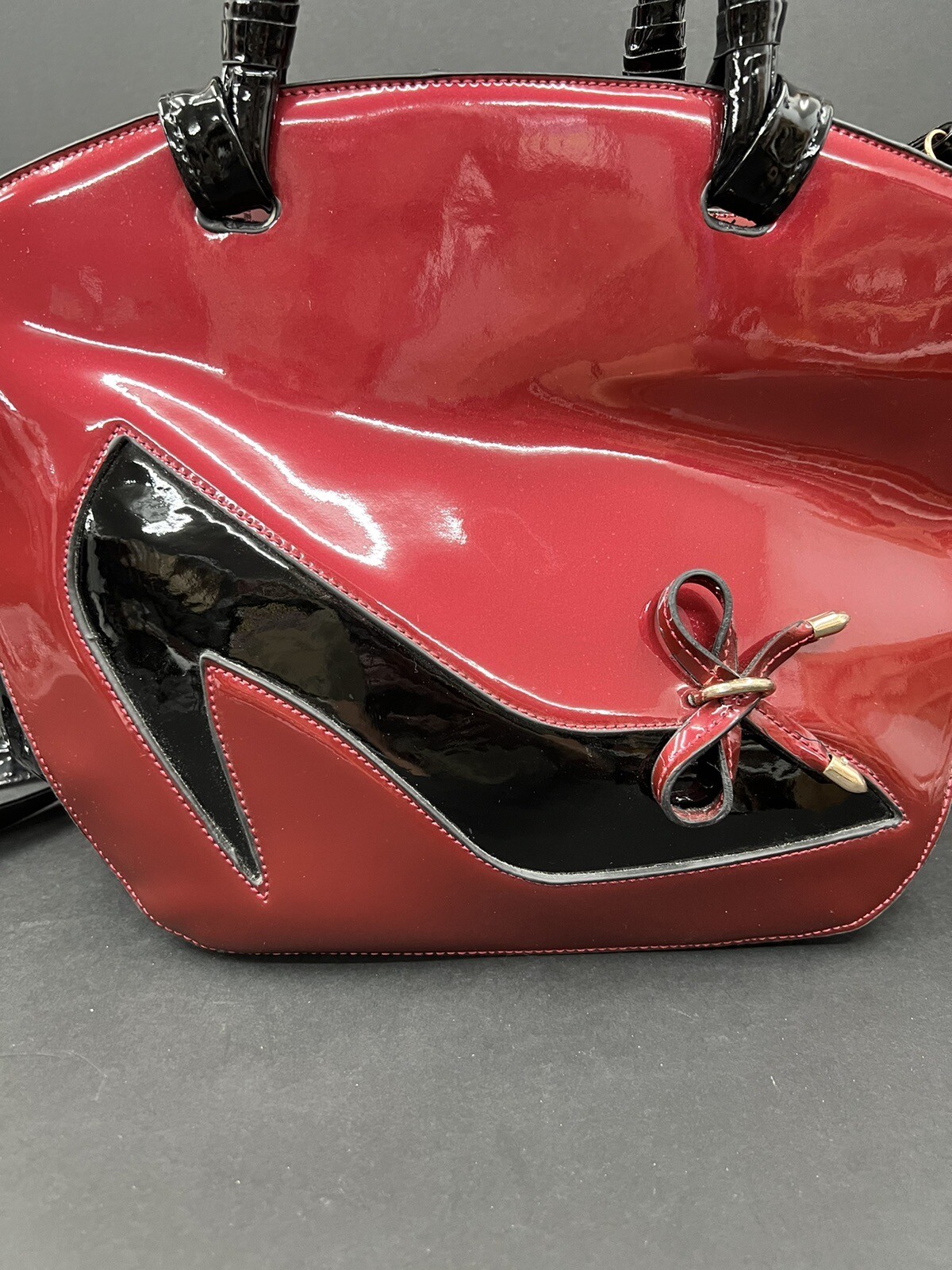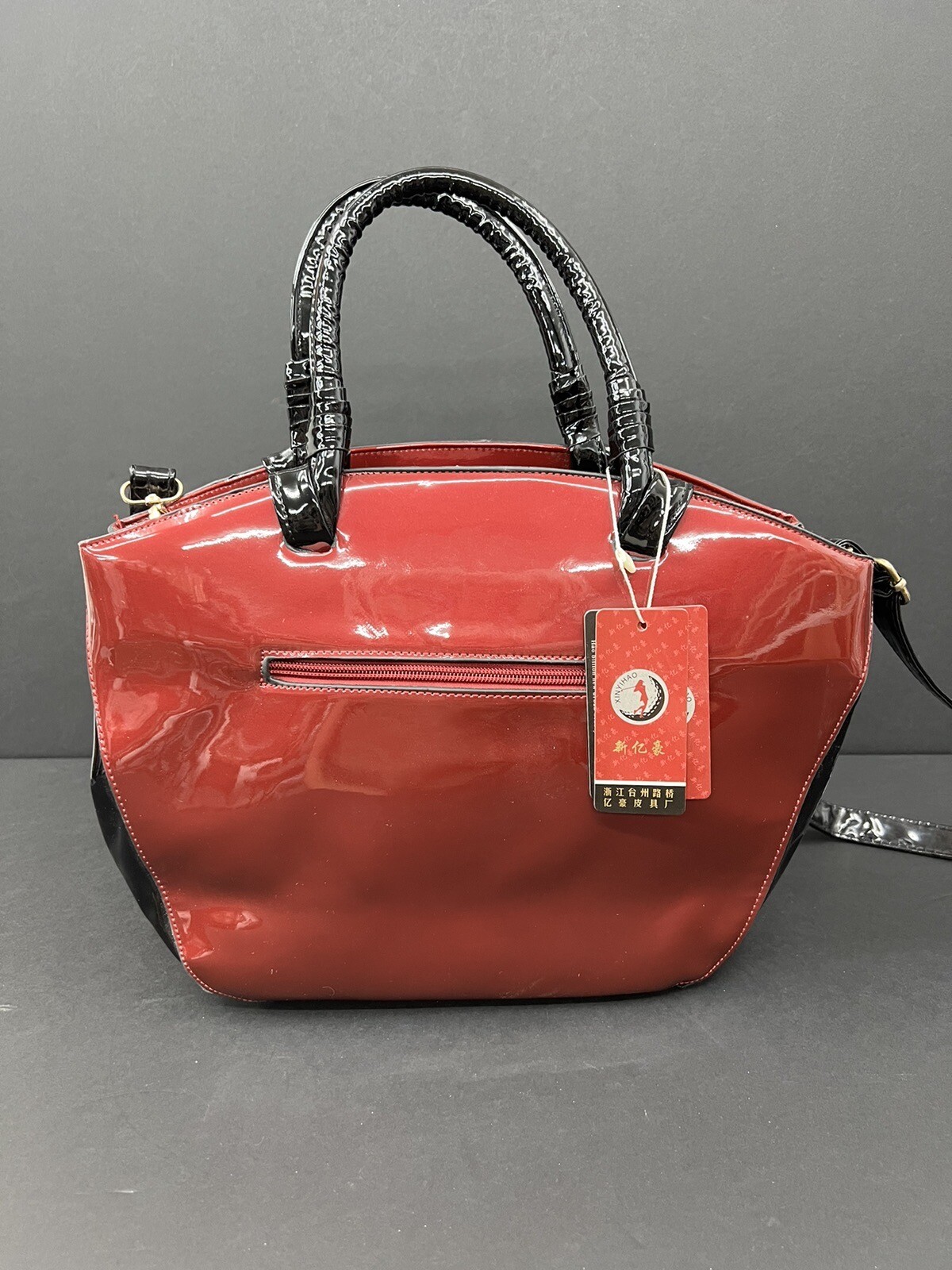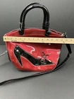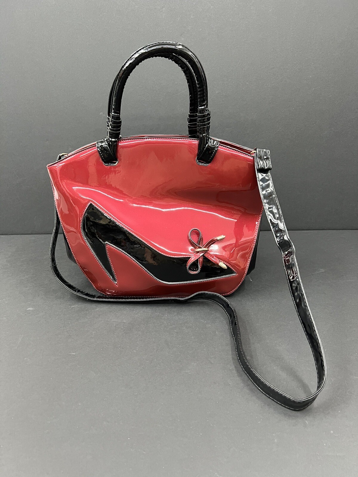 This stylish red and black patent leather purse from Jing Pin Pi Ju is a must-have for any fashion-forward woman. The tote style bag features double handles made of patent leather and a detachable cross-body strap for versatility. The bag has a zip closure and bottom studs to protect the base. The bag has a solid pattern with bow accents and gold hardware. It's medium size with dimensions of 5" x 14" x 8" (width x height x depth). The bag is lined with beige fabric and has both inner and outer pockets. It's stain-resistant and water-resistant making it perfect for everyday use. This bag is a perfect addition to any wardrobe with its hipster, rock, London, 50s, rockabilly, and retro theme.