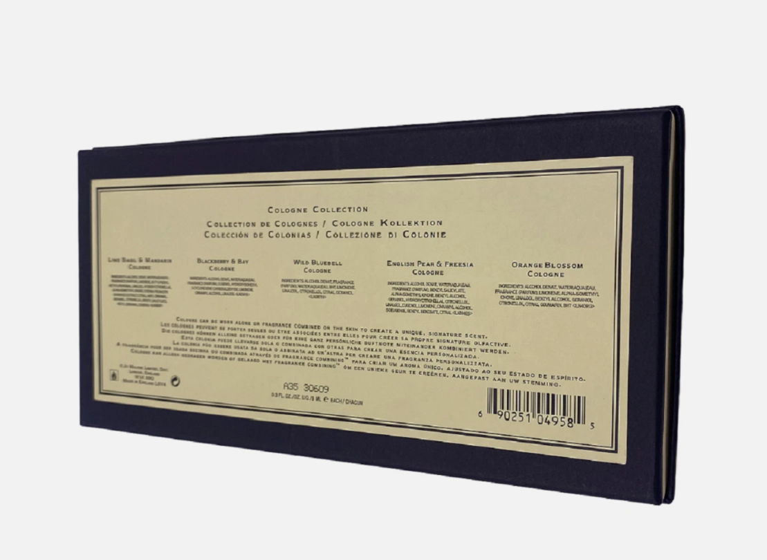Jo Malone London - Cologne Collection Gift Set (5 x 9ml) Discover a beautifully curated collection of five of Jo Malone London's most iconic and timeless fragrances. This elegant set is the perfect introduction to the world of Jo Malone, allowing you to explore a range of scents from citrus and fruity to floral and woody. It makes an exquisite gift for a loved one or a wonderful treat for yourself. 🎁 Gift Set Includes: A collection of five of Jo Malone's most-loved Colognes, each in a 9ml miniature bottle: Lime Basil & Mandarin (9ml): The signature fragrance. Peppery basil and aromatic white thyme bring an unexpected twist to the scent of limes on a Caribbean breeze. English Pear & Freesia (9ml): The sensuous freshness of just-ripe pears wrapped in a bouquet of white freesias, mellowed by amber, patchouli, and woods. Blackberry & Bay (9ml): A burst of deep, tart blackberry juice, blending with the freshness of just-gathered bay and brambly woods. Orange Blossom (9ml): Combines bright top notes of cedrat, green notes, and clementine leaf with a delicate floral heart of water lily and orange blossom. Wild Bluebell (9ml): Wild Bluebell by Jo Malone London is a captivating floral green fragrance, offering a harmonious blend of bellflower, dew drop, green leaves, and clove for a refreshing and nature-inspired scent. ✨ The Format Please note, these are 9ml splash/dabber style miniature bottles, perfect for travel or discovering the collection. 📦 Condition: Brand new and unused ✅ Returns Accepted Within 30 Days We want you to love your purchase! If you're not completely satisfied, you may return your item within 30 days of delivery. 💡 Questions? We're here to help! Message us anytime for assistance before or after your purchase.