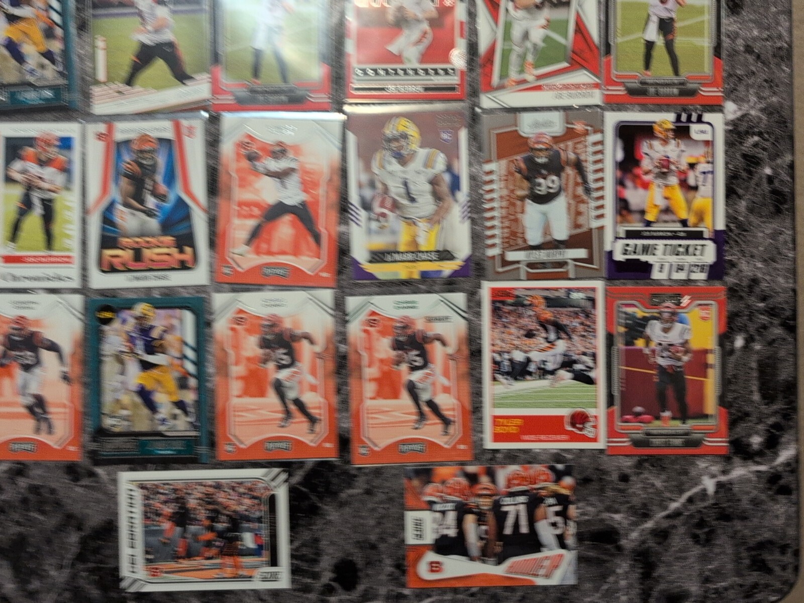 This Cincinnati Bengals NFL Team Card Lot includes a total of 20 cards featuring rookie players like Joe Burrow, Tee Higgins, and Ja'Marr Chase. The cards are from the 2022 Panini Donruss Optic and 2022 Panini Select sets, manufactured in 2020 by Panini. The collection includes base set cards, rookie cards, parallel cards, and inserts, all made of card stock. These sports trading cards are in English and are original licensed reprints, perfect for fans and collectors of the Cincinnati Bengals and the NFL.