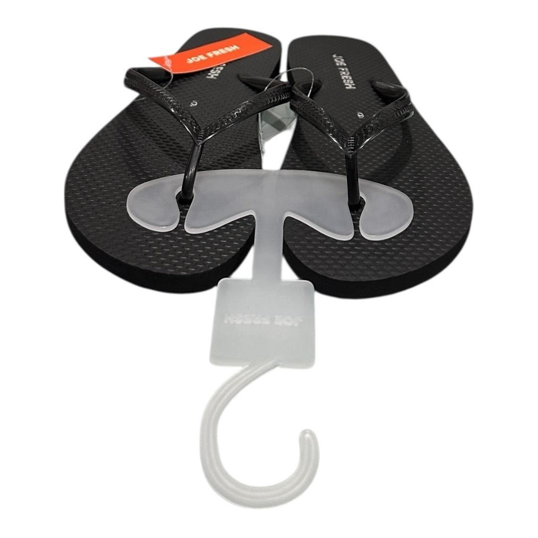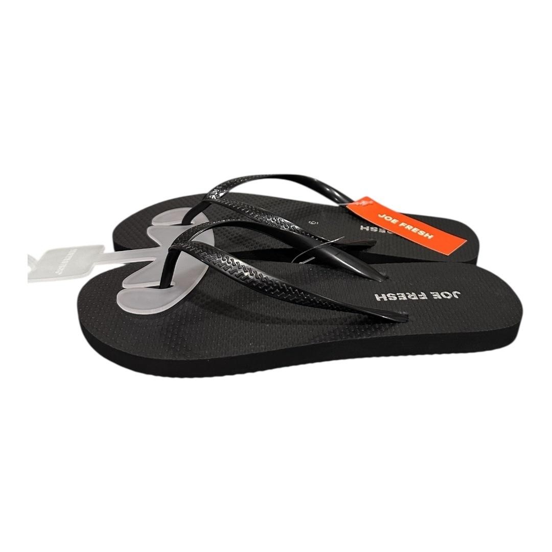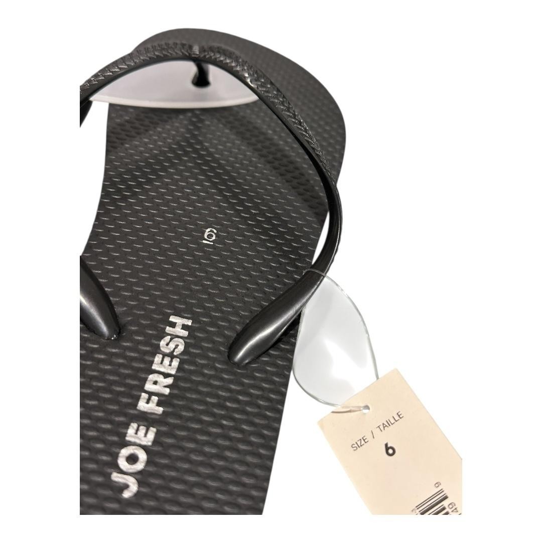 Brand: Joe Fresh Style: Womens flip flop sandals with classic thong straps and flat cushioned soles. Color: Black footbeds with matching black straps in a subtle textured pattern. Size: Womens US 6 (hang tag marked SIZE / TAILLE 6). Materials: Plastic upper thong straps with textured synthetic foam footbeds and man-made outsoles. Details: Easy slip-on design with toe post, lightly textured footbed surface for comfort, chevron-textured tread on the soles for grip, ideal for casual warm-weather wear at the beach, pool, or around the house. Additional info: Joe Fresh branding printed on the footbeds and orange hang tag, pair secured with clear plastic band and white plastic retail hanger; factory stickers remain on the outsoles and original shoe box is not included.