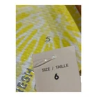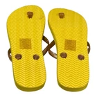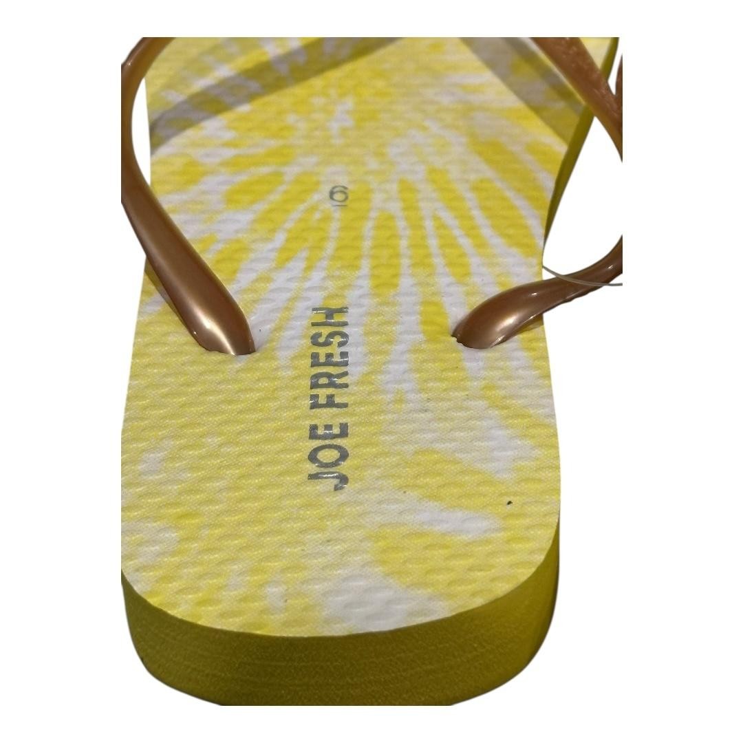 Brand: Joe Fresh Style: Womens flip flop sandals with classic thong straps and flat cushioned soles. Color: Yellow and white tie dye print footbeds with metallic bronze rubber straps and solid yellow outsoles. Size: Womens US 6 (per hang tag marked "SIZE / TAILLE 6"). Materials: Rubber upper straps with textured synthetic foam footbeds and man-made outsoles. Details: Slip-on design with toe post, lightly textured footbed surface for comfort, chevron-textured tread on the soles for grip, ideal for casual warm-weather wear at the beach or pool. Additional info: Joe Fresh branding printed on the footbeds and molded plastic hanger, orange Joe Fresh hang tag attached; sold new without original box.