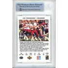 This is a rare and valuable Joe Theismann autographed trading card from the 1991 Upper Deck Domino's Pizza Quarterback Challenge. The card features an hard-signed autograph from Joe Theismann, former quarterback of the Washington Commanders franchise and the University of Notre Dame Fighting Irish. It also comes with a Beckett Authentication Services (BAS) autograph authentication number of 00016509189. The card is made of high-quality card stock and has been encapsulated, making it a great addition to any sports trading card collection. It has a card number of 44 and is an officially licensed trading card manufactured by Upper Deck. The card is in standard size and is a part of the National Collegiate Athletic Association (NCAA) and National Football League (NFL) leagues. The card is a must-have for fans of Joe Theismann, Washington Commanders, and Notre Dame Fighting Irish. Autographed in Black Sharpie. Joe Theismann Autographed Washington Commanders 1991 Upper Deck Dominos Pizza Quarterback Challenge Football Card #44. This signature has been authenticated and Encapsulated by the Experts at Beckett Authentication Services (BAS). Certificate Number 00016509189.