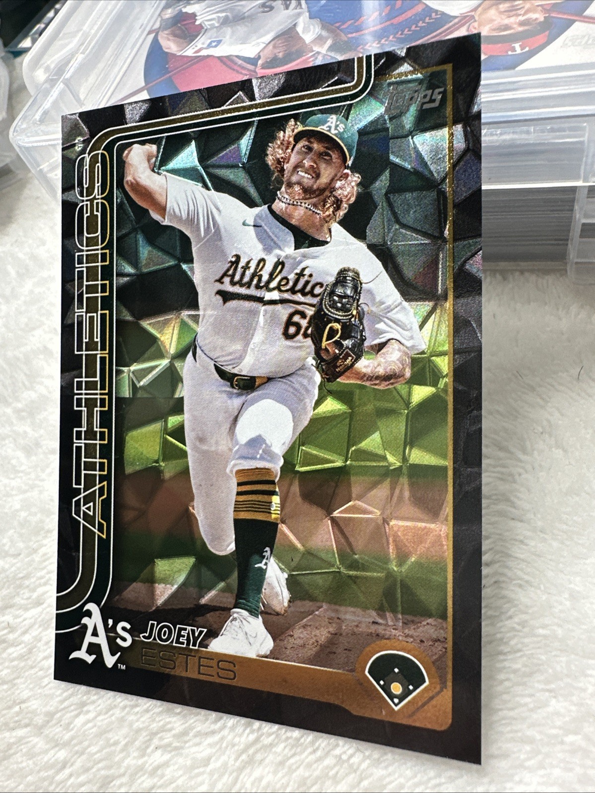 The product is a Joey Estes 2025 Topps Series 2 Black Diamante trading card, limited to only 10 copies. This rare and highly sought-after card features the baseball player from the Athletics team, with a unique black diamante parallel variety. Produced by Topps, the card is part of the 2025 Topps set and is in English language. As a limited edition collectible, this card is a valuable addition to any sports trading card collection for fans of Joey Estes and baseball memorabilia.