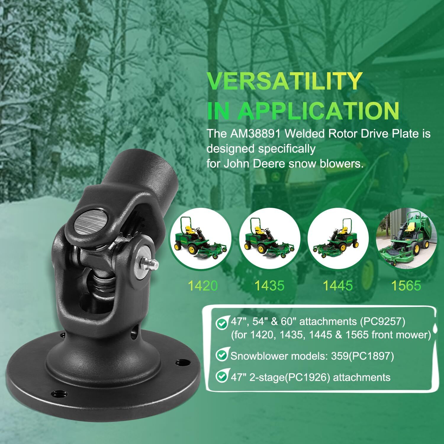 Fitment: The AM38891 Welded Rotor Drive Plate is designed specifically for John Deere snow blowers. It's compatible with Snow Blower models 359, 47", 54" & 60" attachments (PC9257) 1420, 1435, 1445 & 1565 front mower, for 47" 2-stage(PC1926) attachments. This precise fit ensures that it integrates seamlessly with the existing components of these particular John Deere snow - blowing machines Features: 1) The welded construction of the drive plate is a significant feature. Welding provides a strong and durable bond between different parts of the plate. This design choice helps to ensure that the drive plate can withstand the high-torque forces generated during the operation of the snow blower's rotor. The welded joints are less likely to come apart under stress compared to other forms of fastening 2) It's made from materials that are suitable for heavy-duty use in a snow-blowing environment. These materials are strong and resistant to wear and tear. They can endure the impact of snow, ice, and any debris that might be picked up during snow-clearing operations. The material also has to withstand the cold temperatures that are typical during snow-blowing activities 3) The drive plate plays a crucial role in the operation of the snow blower's rotor. It transfers power from the snow blower's engine to the rotor, enabling the rotor to rotate and throw snow. The AM38891 drive plate is designed to provide efficient power transfer, ensuring that the rotor spins at the appropriate speed and with enough force to effectively clear snow from the driveway, sidewalk, or other surfaces 4) By providing a reliable connection between the power source and the rotor, this drive plate helps to improve the overall efficiency of the snow blower. It helps to maintain a consistent snow-throwing distance and pattern, allowing for a more even clearing of snow and reducing the need for multiple passes in the same area 5) As a high-quality replacement part, the AM38891 drive plate can help reduce the downtime of the snow blower. If the original drive plate fails, replacing it with this reliable alternative can quickly get the snow blower back into operation. This is especially important during heavy snowfall seasons when a functional snow blower is essential Package included: AM38891 Drive Plate