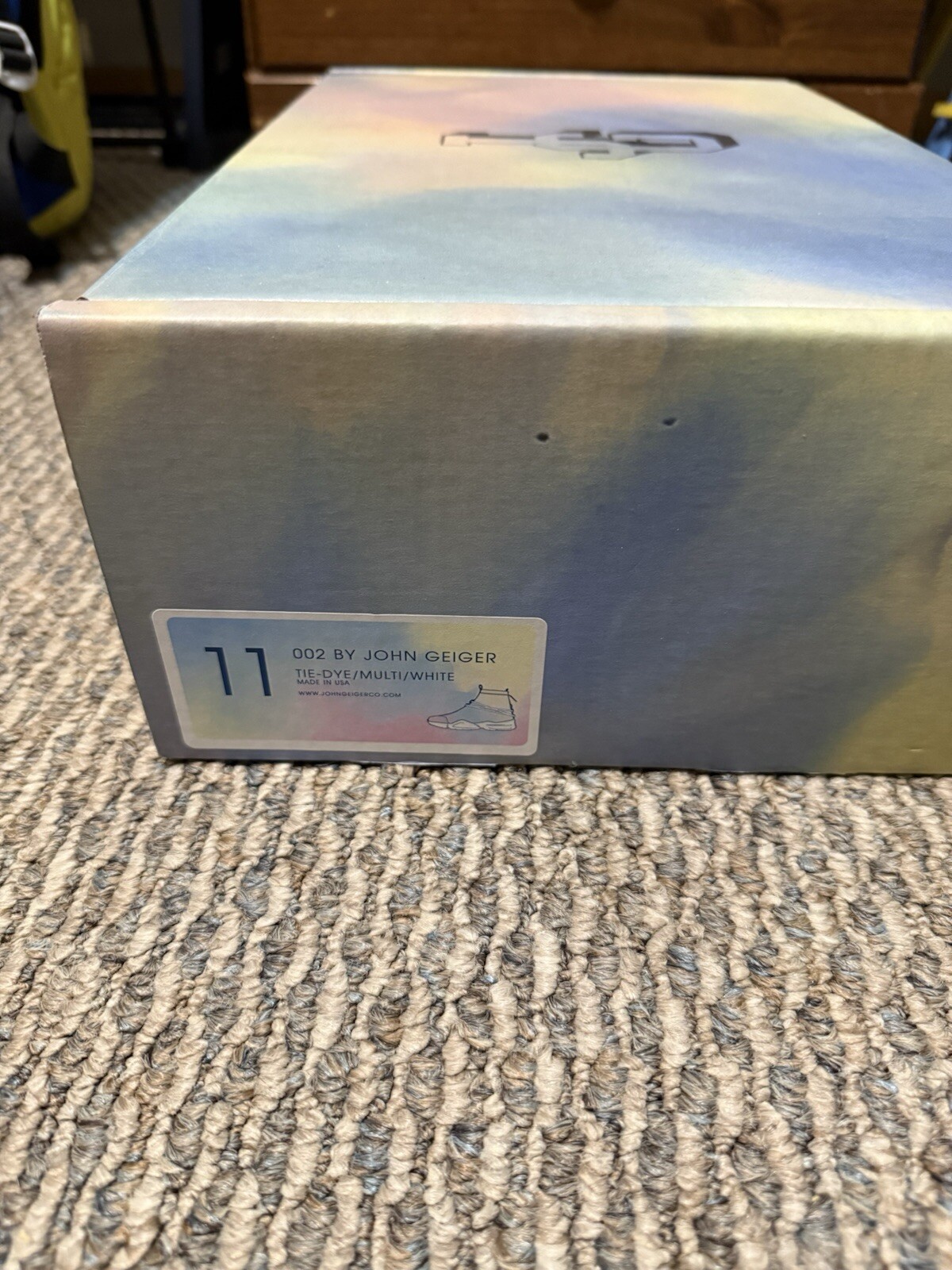 This John Geiger 002 Coachella sneaker in size 11 is a pre-owned athletic shoe for men. In great condition with box. Worn once! It features a unique tie dye design that was individual to each sneaker set when released. Low quantity of this shoe produced! Great material and adds a rare piece to any collector’s closet.