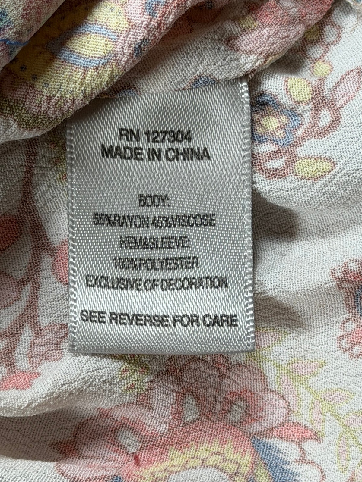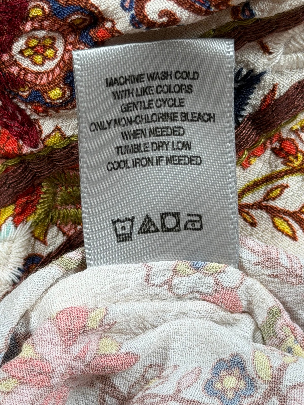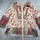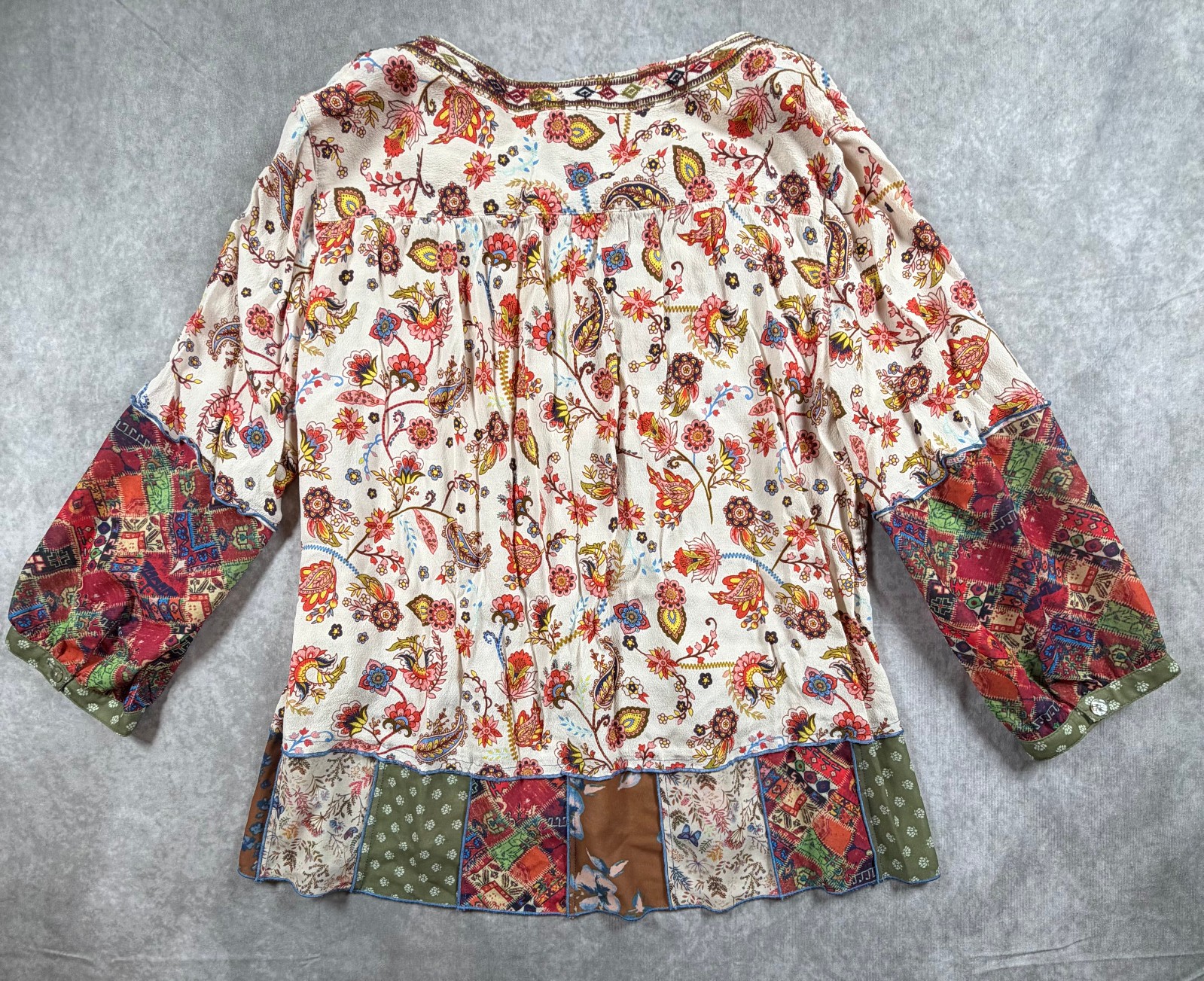 John Mark boho tunic blouse in size Large with abalone-style buttons and embroidered detail at the neckline. Lightweight woven fabric with a colorful floral and paisley print, plus patchwork contrast on the sleeves and hem. Excellent condition with no noticeable flaws. 55% Rayon 45% Viscose, sleeve is 100% polyester. Top to bottom 23-25” Pit to pit 21” Shoulder to Shoulder 17”