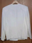 The John Meyer Blazer Jacket in women's size 16 is a stylish and sophisticated outerwear piece in a cream color with embroidered accents. The jacket features padded shoulders for added volume and a tailored fit, perfect for a polished and elegant look. Made from canvas material, this suit blazer is a versatile addition to any woman's wardrobe, adding a touch of sophistication to any outfit.