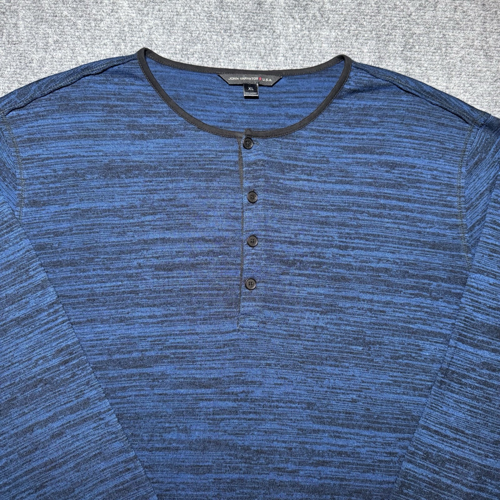 John Varvatos Henley Pullover Long Sleeve Shirt Men XL Blue Striped VIscose Henley is in excellent condition as shown in pictures, size is also shown in pictures. Feel free to ask any questions about this item, all of our items come from a smoke free environment.