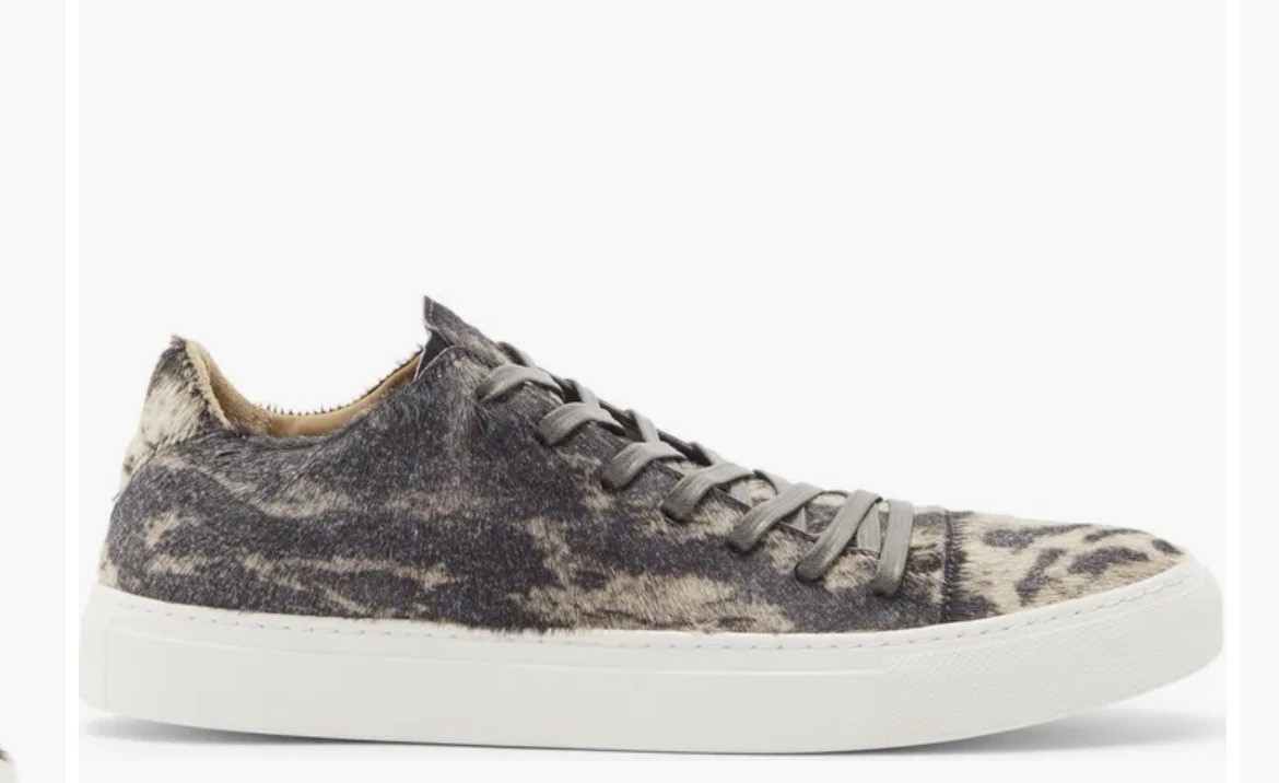Product Details Brand: John Varvatos Model: Reed 315 Low Top Sneaker Material: Genuine calf hair and leather upper, with a rubber sole Color/Pattern: Features a grey and black animal (leopard) print pattern with matching grey laces and a white sole Origin: Crafted in Portugal