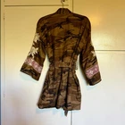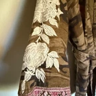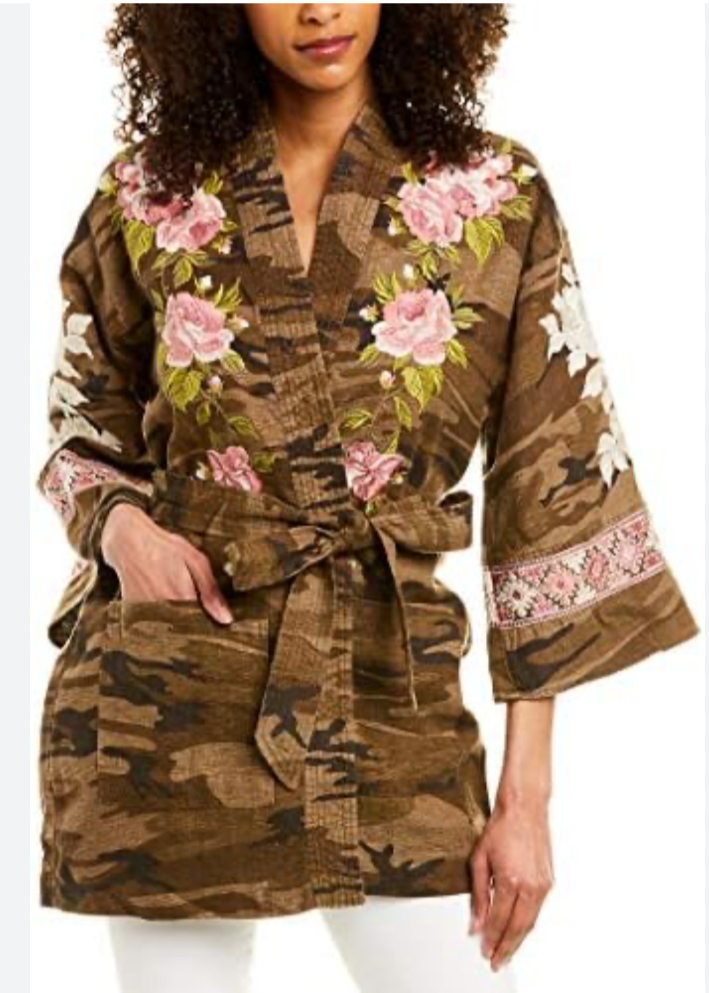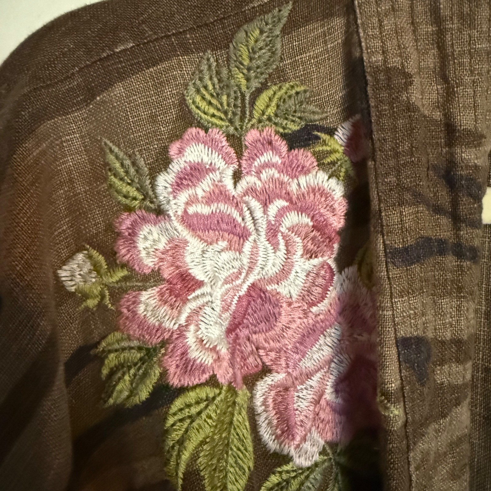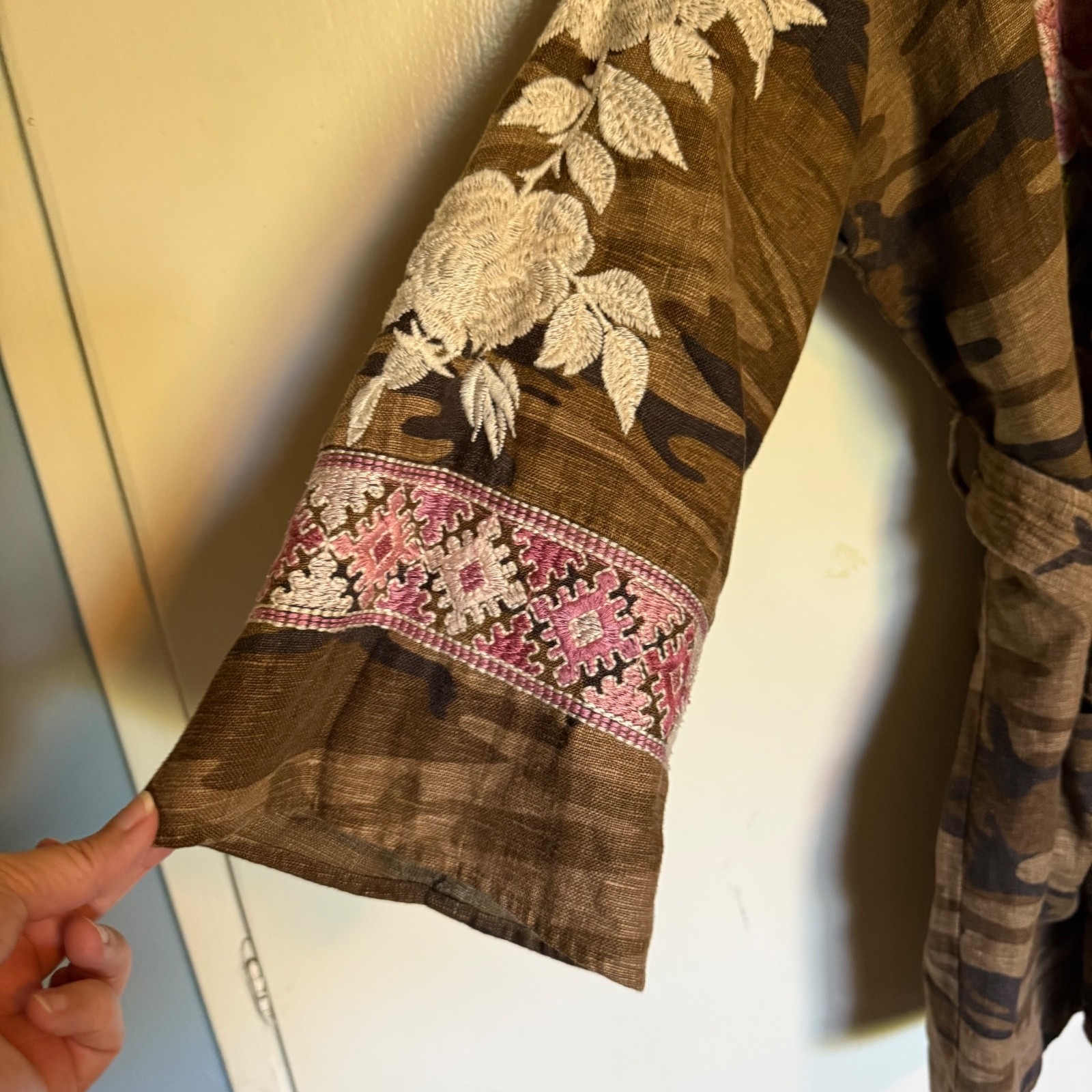Johnny Was Flora Camo Embroidered Kimono Duster Belted Linen Kimono Embroidered Camo with floral embroidery 3/4 sleeves Matching tie belt 2 front pockets 100% linen Machine wash cold Size tag is missing please refer to measurements for sizing. Measurements Length 30" Pit to Pit 21" This kimono is in good preowned condition but is missing the Johnny Was label and size tag. Smoke free home. Keywords Boho, Bohemian, Coastal Grandma, Western