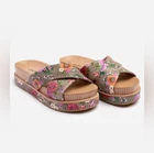 Johnny Was "Jenna" platform sandals in floral-print calf leather 2.00 in / 50 mm wedge heel Open toe Crisscross vamp Slide style Rubber outsole Importe About Johnny Was: Johnny Was designs draw inspiration from music and bohemian influences. The collection features a modern interpretation of vintage boho chic, with flowing silhouettes and luxurious fabrics.