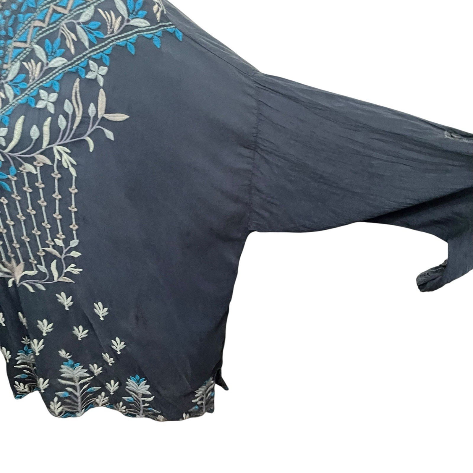 This Johnny Was embroidered tunic top features intricate floral stitching in soft turquoise and cream against a navy blue backdrop. Made from 100% cupro rayon with polyester trim, it has a split neckline, long sleeves, and a relaxed, flowy fit perfect for boho-inspired styling. Brand: Johnny Was Style: Embroidered Boho Tunic Top Color: Navy Blue with multicolor embroidery Size: Women’s XL Material: Self: 100% Cupro Rayon | Trims: 100% Polyester Features: Split neckline, floral embroidery, long sleeves with button cuff, relaxed boho silhouette Condition: Pre-owned; in good condition. Small holes noted at the front (see photos). No major flaws otherwise. Please inspect all photos for full condition details. Style Tags: embroidered tunic, boho blouse, floral folk top, artisan detailing, Johnny Was style Aesthetic Tags: global bohemian, coastal luxe, elevated folkwear, laidback wanderer, soft heritage