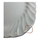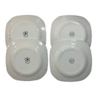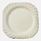 This product is a set of 4 square salad plates, measuring 7 1/2 inches each, made by Johnson Brothers in England. The plates feature a white swirl pattern, showcasing a Regency style. Plates are dishwasher and microwave safe. There are 2 different backstamps please look at picture. Plates have been gently used with minimal utensil marks must hold up to the light to see. One plate on a corner has a minor beige stain please refer to posted picture.