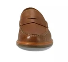 This is a Johnston & Murphy Lyles men's penny loafer in tan full grain Venetian moc style. It features a solid pattern, round toe shape, and slip-on closure. The shoe is made with leather upper, lining, and insole materials, and has a rubber outsole. The shoe width is M and the size is 9. This is a dress shoe that is suitable for formal occasions.