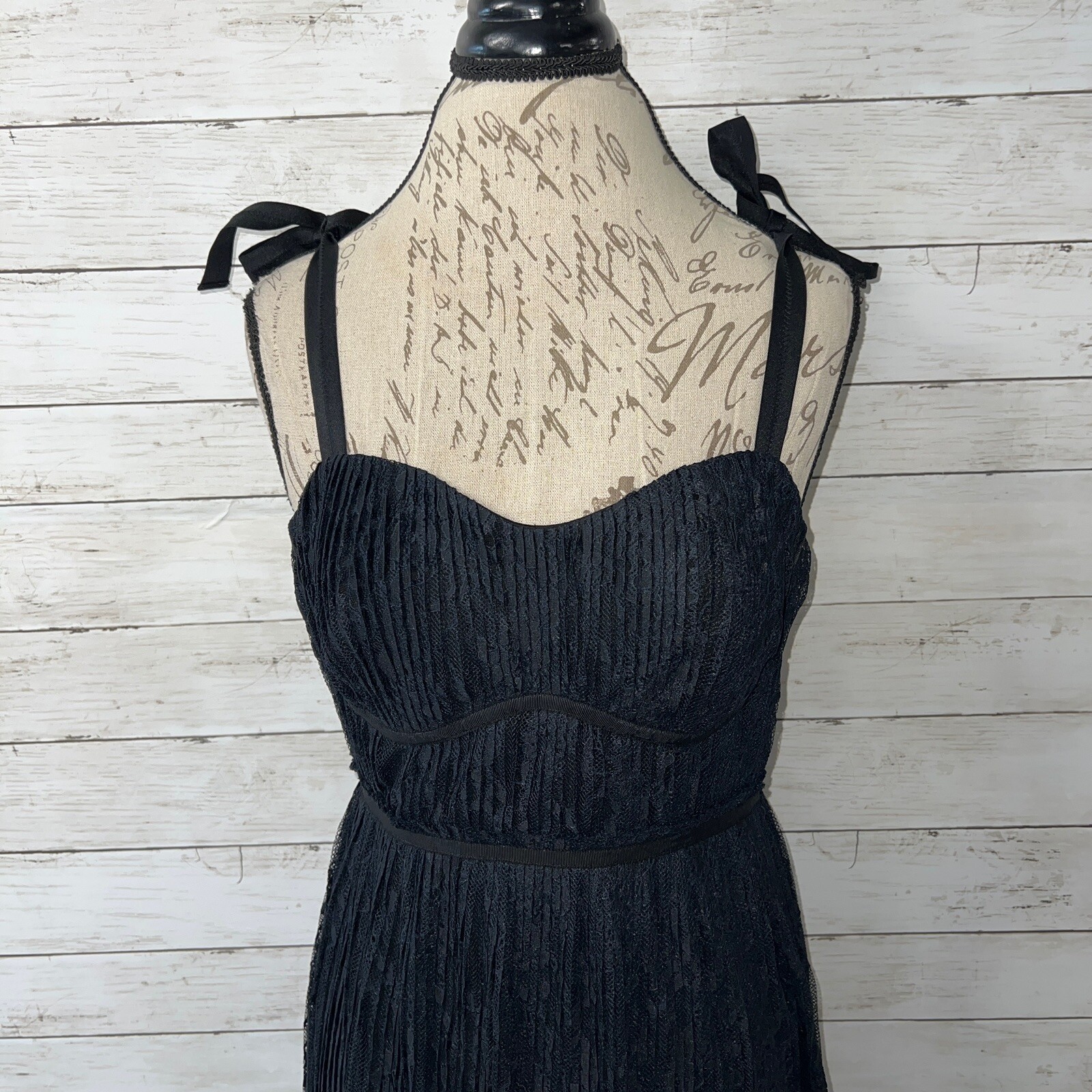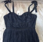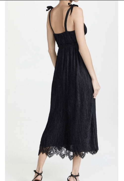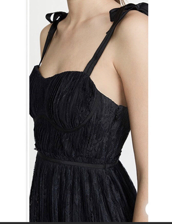 NWT! Jonathan Simkhai size 6 Bonnie Dress in black. Mid weight pleated lace shell. Sweetheart neckline. Elasticized self-tie shoulder straps. Bustier-style banding at bodice. Scalloped eyelash lace edges. Hidden side zip close. Lined. Bust: 16”, Waist: 14”, Hips: 21”, Length: 52” Shell & Lining: 100% Polyester Price tag: $645.00