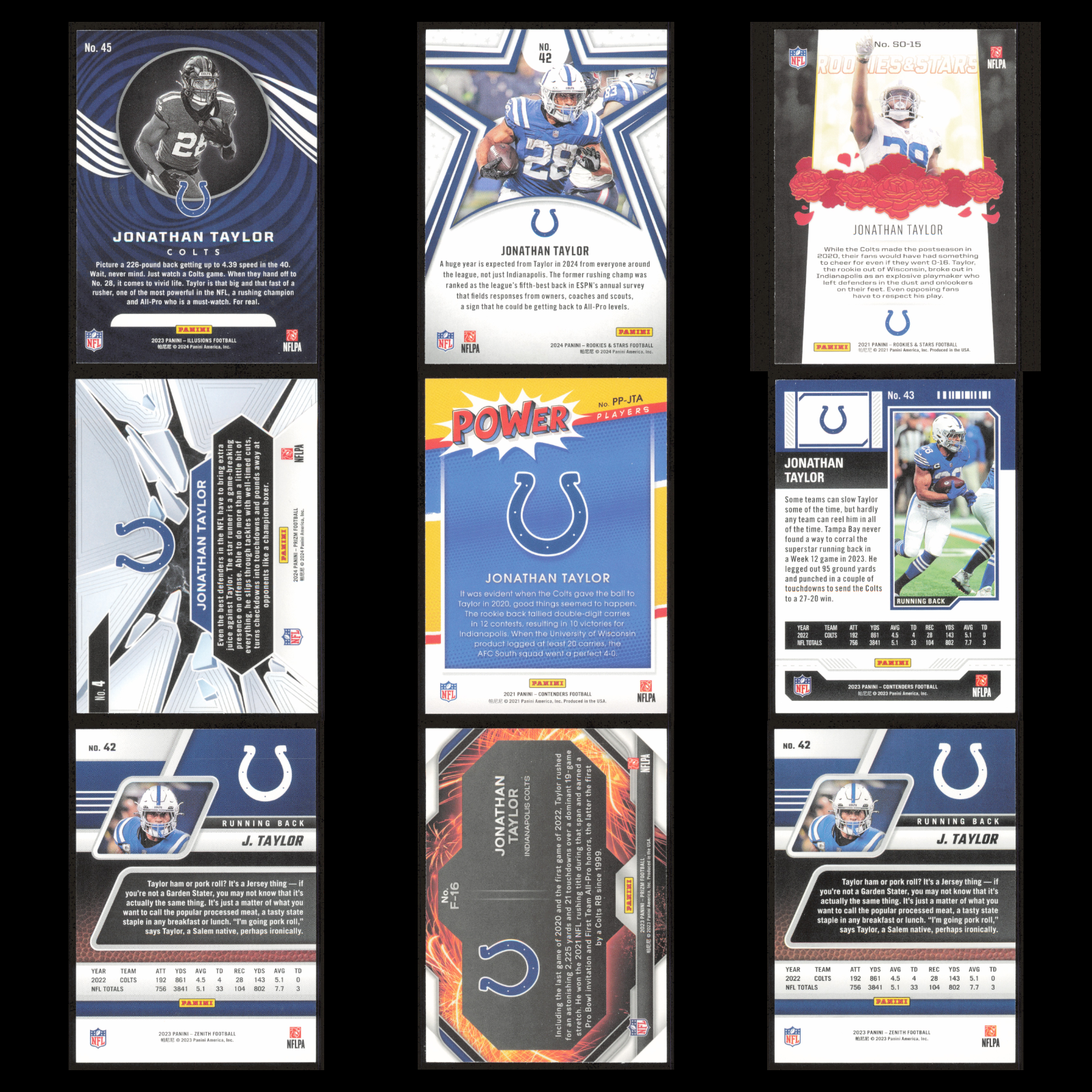 You will receive the exact cards in the scans. The scans are not stock photos—they are actual scans of the cards you will receive. Please send a message if you have any questions or read the full description. Jonathan Taylor Lot 9 Football Cards 2023 Panini Illusions Indianapolis Colts NM You will receive the exact cards in the scans. The scans are not stock photos—they are actual scans of the cards you will receive. Please send a message if you have any questions. Overall these cards are in near-mint condition or better. Equivalent to cards fresh from the pack. Learn more about eBay's card condition guidelines here: https://pages.ebay.com/cardconditions/ Please view the scans and send a message if you have any questions about condition. List of Cards Included This list was generated by AI attempting to identify the cards from the scans and it may contain errors. For some types of cards/sets the AI can be very accurate and for others it can be very bad. If you were searching for a card on this list please confirm that it is in the lot by checking the images because the images are of the exact cards you will receive. If you have any questions, please send a message. 2023 Panini Illusions #45 Jonathan Taylor Indianapolis Colts Football Card 2024 Panini Rookies - Stars #42 Jonathan Taylor Indianapolis Colts Football Card 2021 Panini Rookies - Stars Standing Ovation #SO-15 Jonathan Taylor Indianapolis Colts Football Card 2024 Panini Prizm Break #4 Jonathan Taylor Indianapolis Colts Football Card 2021 Panini Contenders Power Players #PP-JTA Jonathan Taylor Indianapolis Colts Football Card 2023 Panini Contenders Season Ticket #43 Jonathan Taylor Indianapolis Colts Football Card 2023 Panini Zenith #42 Jonathan Taylor Indianapolis Colts Football Card 2023 Panini Prizm Fireworks #57 Jonathan Taylor Indianapolis Colts Football Card 2023 Panini Zenith Red Zone #42 Jonathan Taylor Indianapolis Colts Football Card