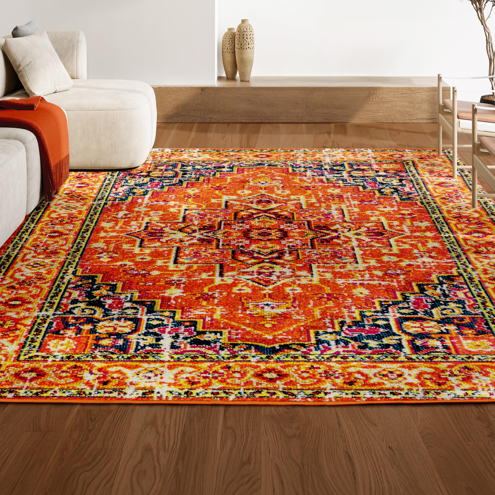 This rug's bright colors and vintage pattern add a Bohemian touch to your modern loft, Boho bedroom or colorful cottage. With its kid-friendly busy pattern, this rug is ideal for a kitchen, living room, den, bedroom or entry. An orange background, geometric central medallion, and bold color accents give this rug funky style. Actual Dimension: 7 ft. 9 in. x 10 ft. Color: Orange/Blue Thickness measures: 0.35 in. Vacuum regularly and spot clean as needed; avoid direct and continuous exposure to sunlight; use brushless vacuum; remove spills immediately; if liquid, blot with clean, undyed cloth by pressing firmly around the spill to absorb as much as possible; for hard to remove stains, professional rug cleaning is recommended; store in a dry, well ventilated area and rotate for consistent wear . The JONATHAN Y Rug Collection creates modern area rugs inspired by ancient rug traditions from around the globe. We believe that affordable rugs should be fabulous…. and the more choice, the better! Our trend-worthy designs are durable and easy-care, so they’re ideal for busy lifestyles. Whether you love Boho-chic colors or Minimalist neutrals, we’ll style your floors at a price you’ll love. PET-FRIENDLY AND DURABLE: Durable for high-traffic areas, soft and comfortable area rug perfect for families with kids; Low-pile synthetic rug fibers won’t trap dirt and debris, so they’re pet-friendly and easy to clean STAIN-RESISTANT AND NON-SHEDDING: This rug is made from synthetic fibers that are water resistant, stain resistant; It’s been machine-woven so the rug fibers will stay put; When properly cared for, this rug won’t shed fluff into your home EASY TO CARE FOR: Vacuum regularly; Always raise or turn off the beater bars on your vacuum; Spot clean stains immediately with a mild detergent or carpet cleaning product, then rinse thoroughly and blot dry; Professional rug cleaning is recommended Power loomed from durable synthetic fibers, with a short 0.31" pile This rug's bright orange background features bright accents of navy, gold, fuchsia and teal