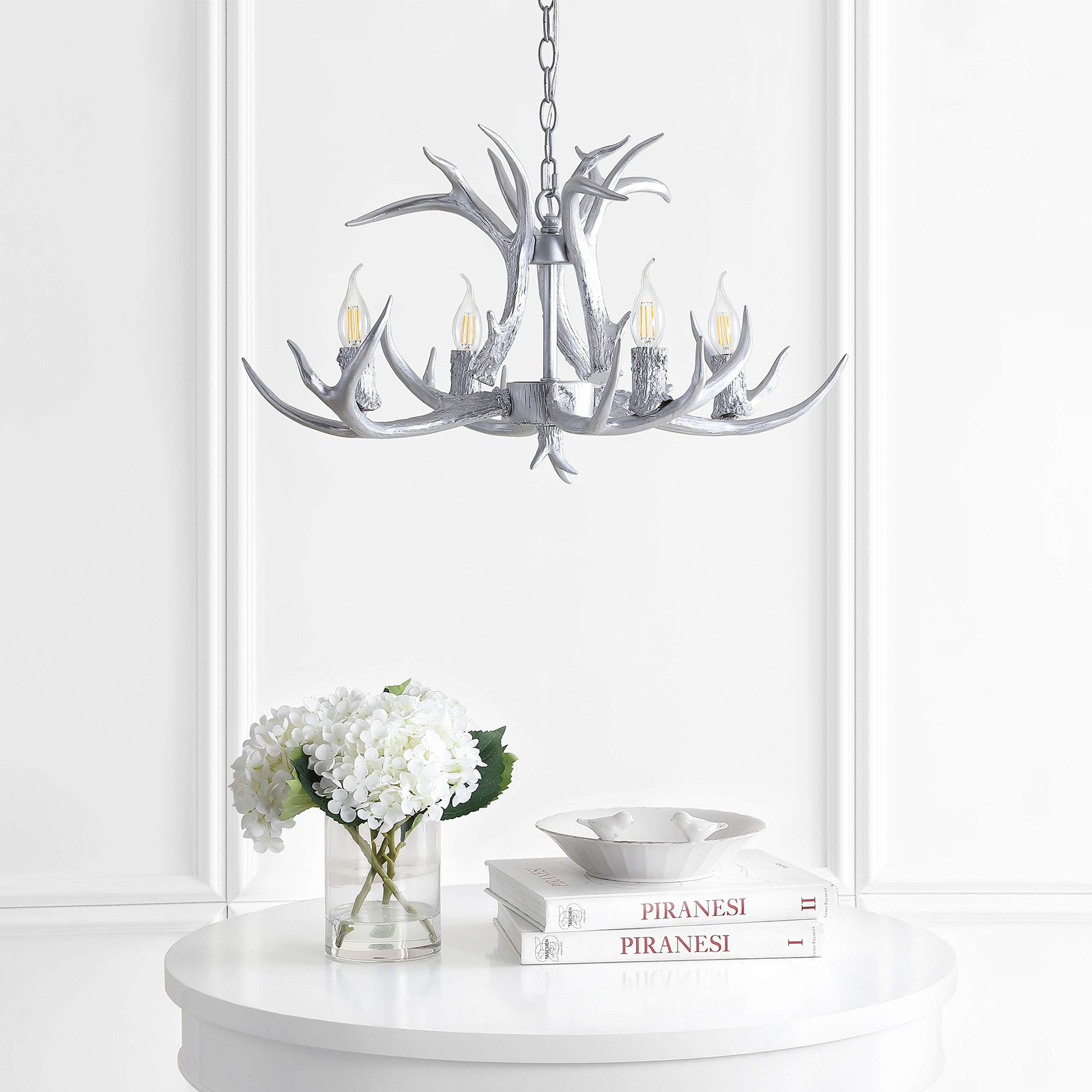This faux antler chandelier transports us to our dream mountain home, bringing nature inside with a contemporary rustic touch. Featuring an adjustable metal pull, it can be adjusted to your ceiling height for a semi-custom look. Each unique finish brings a refreshing quality to this beautiful piece. QUALITY CONSTRUCTION: Ceiling light fixtures are commonly used as general lighting; Available in amazing variety; Replace old, outdated ceiling lights is a fast and affordable way to update your home desgin ENERGY-SAVING LED BULBS INCLUDED: LED bulbs are included with every light fixture; All of our lighting is ETL Listed and meets 120-volt UL standards for safety and quality; Professional installation is recommended for all ceiling light fixtures SATISFACTION GUARANTEED: Every JONATHAN Y design is created with uncompromising attention to detail, using only the highest quality components; Based in Soho, New York, designer Jonathan and his talented team create affordable high-end home decor Finished in silver, the resin body of this piece resembles textured antlers Fixture can be adjusted to your desired length