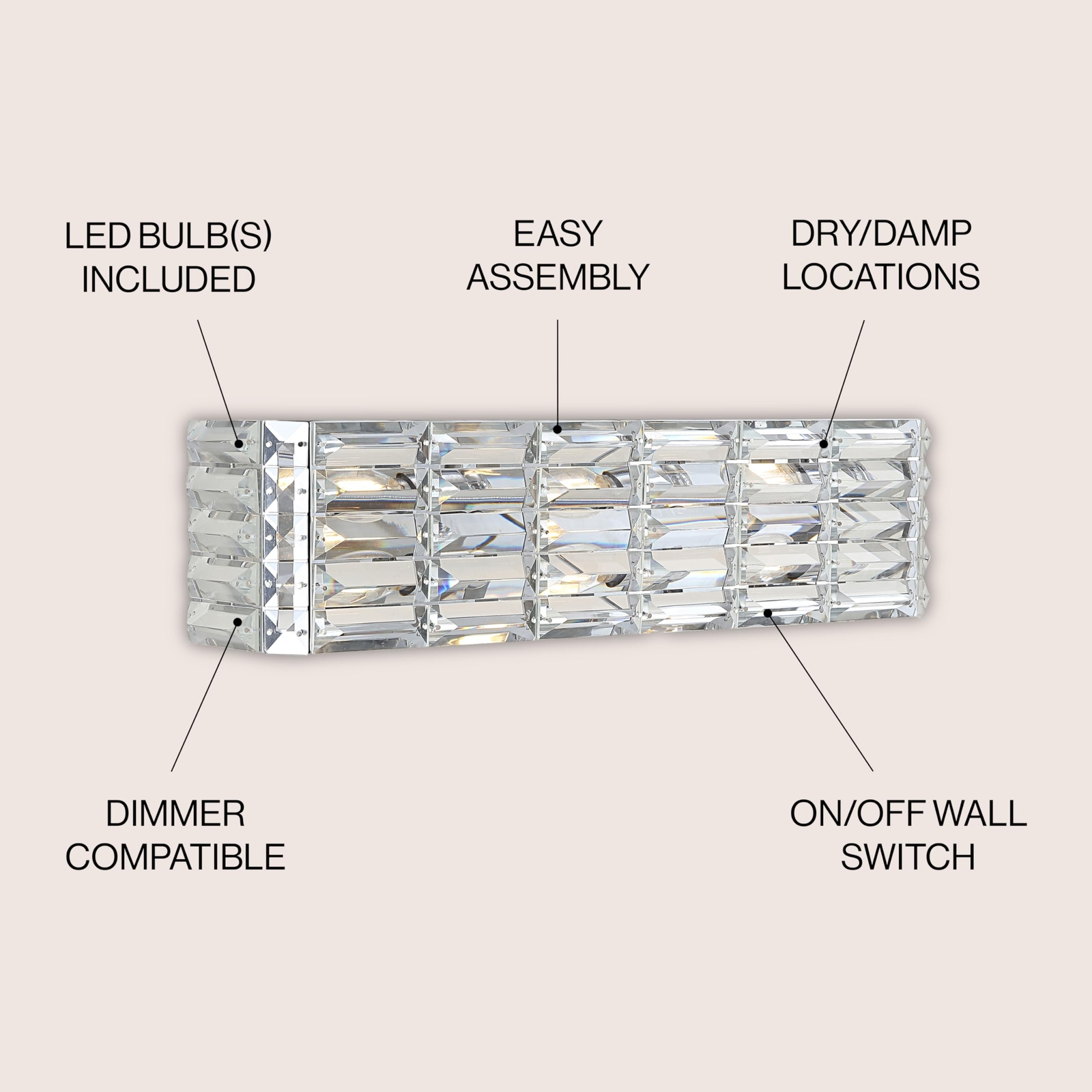 JONATHAN Y JYL7540A Evelyn Crystal Rectangle 24.25" 3-Light Iron/Crystal Glam Modern LED Vanity Light Classic 2700K LED 2W Bulbs Included Bathroom Hallway Living Room Bedroom Mirror Cabinet, Chrome Technical Details Brand JONATHAN Y Color Chrome Material Iron, Crystal Style 3-Light Light fixture form Vanity Room Type Entryway, Kitchen, Bathroom, Living Room, Hallway Product Dimensions 24.25"L x 5.13"W x 6"H Indoor/Outdoor Usage Indoor Power Source AC Special Feature Corded Control Method Remote Light Source Type LED Finish Type Polished Shade Material Crystal Number of Light Sources 3 Voltage 120 Volts Light Color Warm White Shape Rectangle Included Components Lighting Fixture Embellishment Crystal Lighting Method Adjustable Item Weight 8.8 Pounds Number of Items 1 Wattage 25 watts Bulb Base G9 Controller Type Push Button Unit Count 1.0 Count Brightness 420 Lumen Mounting Type Wall Mount Shade Color Clear Fixture Type Non Removable Assembly Required Yes Manufacturer JONATHAN Y UPC 840011412948 Recommended Uses For Product for Bathroom, Hallway, Living Room, Bedroom, Mirror Cabinet Model Name Evelyn Crystal Rectangle Modern LED Vanity Light Classic Glam Modern Transitional 2700K LED2W Item Weight 8.8 pounds Country of Origin China Item model number JYL7540A Size 3 Bulb Finish Polished Item Package Quantity 1 Number Of Pieces 1 Cutting Diameter 24.25 Inches Plug Format A- US style Special Features Corded Average Battery Life 50000 Hours Assembled Diameter 24.25 Inches QUALITY CONSTRUCTION: Wall light fixtures are used as general lighting; Available in amazing variety; Replacing old, outdated wall lights is a fast and affordable way to update your home design ENERGY-SAVING LED BULBS INCLUDED: LED bulbs are included with every light fixture; All of our lighting is ETL Listed and meets 120-volt UL standards for safety and quality; Professional installation is recommended for all wall light fixtures SATISFACTION GUARANTEED: Every JONATHAN Y design is created with uncompromising attention to detail, using only the highest quality components; Based in Soho, New York, designer Jonathan and his talented team create affordable high-end home decor Give your bathroom vanity an instant glam makeover with the sparkle of real crystal and chrome This 3-light fixture is perfect for a single sink in a large bathroom; or use one over each sink on a double vanity Crystal prisms are set like jewels into a long, glamorous vanity light with mid-century flair. Add vintage glam over a sink or vanity, for an Art-Deco-inspired bathroom. A sparking chrome finish makes this light perfect for contemporary bathrooms too. Shipping We offer FREE shipping on all orders! We ship within Three business days of payment, usually sooner. We use a selection of shipping services such as UPS, FedEx, USPS etc. We only ship to the lower 48 states, no APO/FPO addresses or PO Boxes allowed. Local pickups and combined shipping options are not provided at this time. Return You can return a product for up to 30 days from the date you purchased it. Any product you return must be in the same condition you received it and in the original packaging. Please keep the receipt. Payment We accept payment by any of the following methods: PayPal Please pay as soon as possible after winning an auction, as that will allow us to post your item to you sooner! Feedback Customer satisfaction is very important to us. If you have any problem with your order, please contact us and we will do our best to make you satisfied. Contact Us If you have any queries, please contact us via ebay. We usually respond within 24 hours on weekdays. Please visit our eBay store to check out other items for sale! Thank you for shopping at our store.