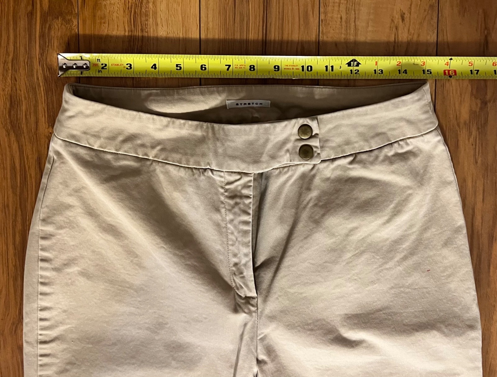 The Jones New York Sports Khaki Pants in women's size 8 are a versatile and stylish addition to any wardrobe. These beige pants feature a solid pattern with a zip, button, stretch, and snap closure, making them perfect for travel, casual wear, workwear, or business attire. Made from a comfortable cotton-spandex blend, these pants offer a mid-rise fit with a straight leg style and flat front design. The stretch fabric ensures a comfortable and flattering fit, while the timeless khaki style is suitable for all seasons. Plus, they are machine washable for easy care.