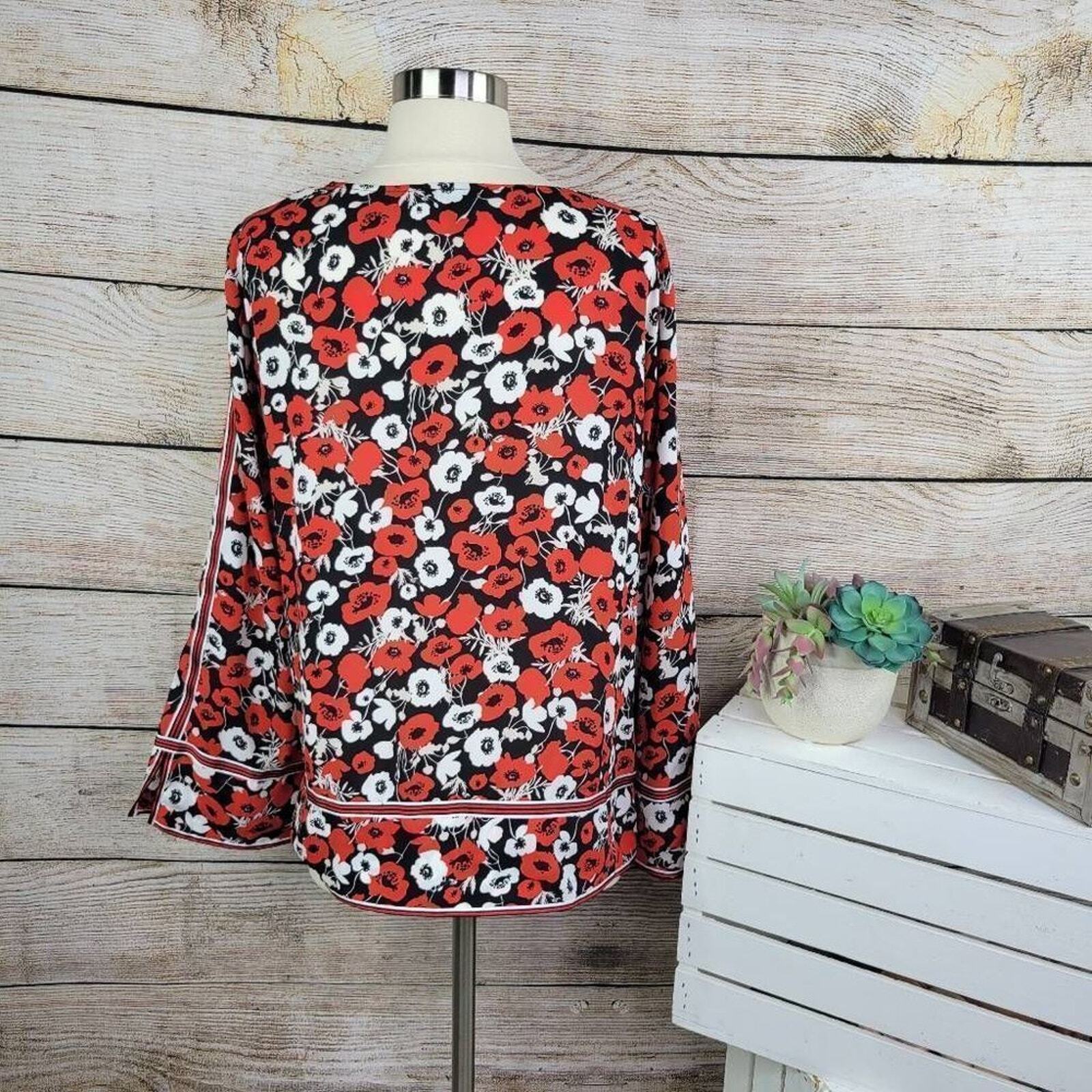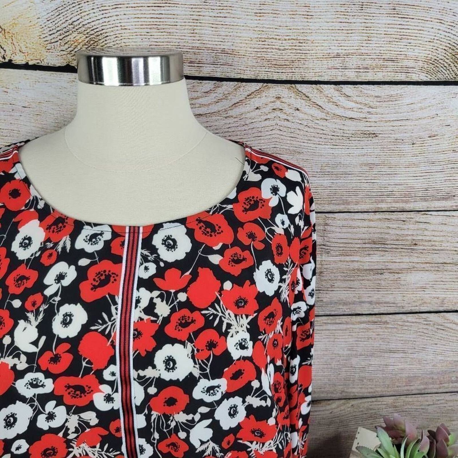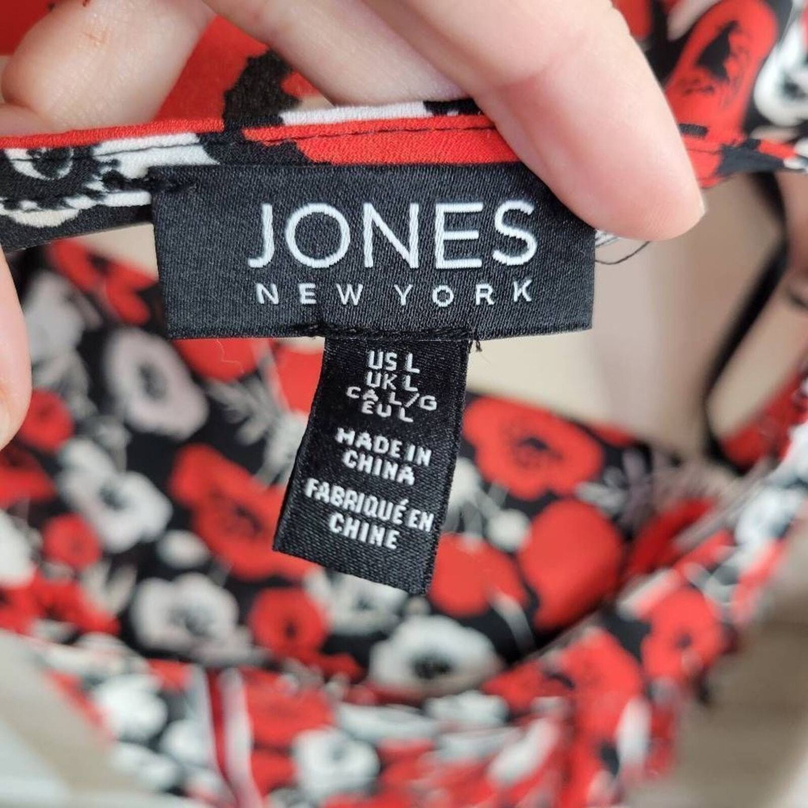 Features: Brand: Jones New York Department: Women Closure: Pull over top Style: Casual to dressy Neckline: Round Neck Sleeves: Long with slits (hand level) Size: Large Color: Red and Black Polyester Condition: Excellent pre-owned in good condition Care: - Machine wash cold with like colors - Gentle cycle only - Non-chlorine bleach when needed - Tumble dry-low remove promptly - light iron if necessary