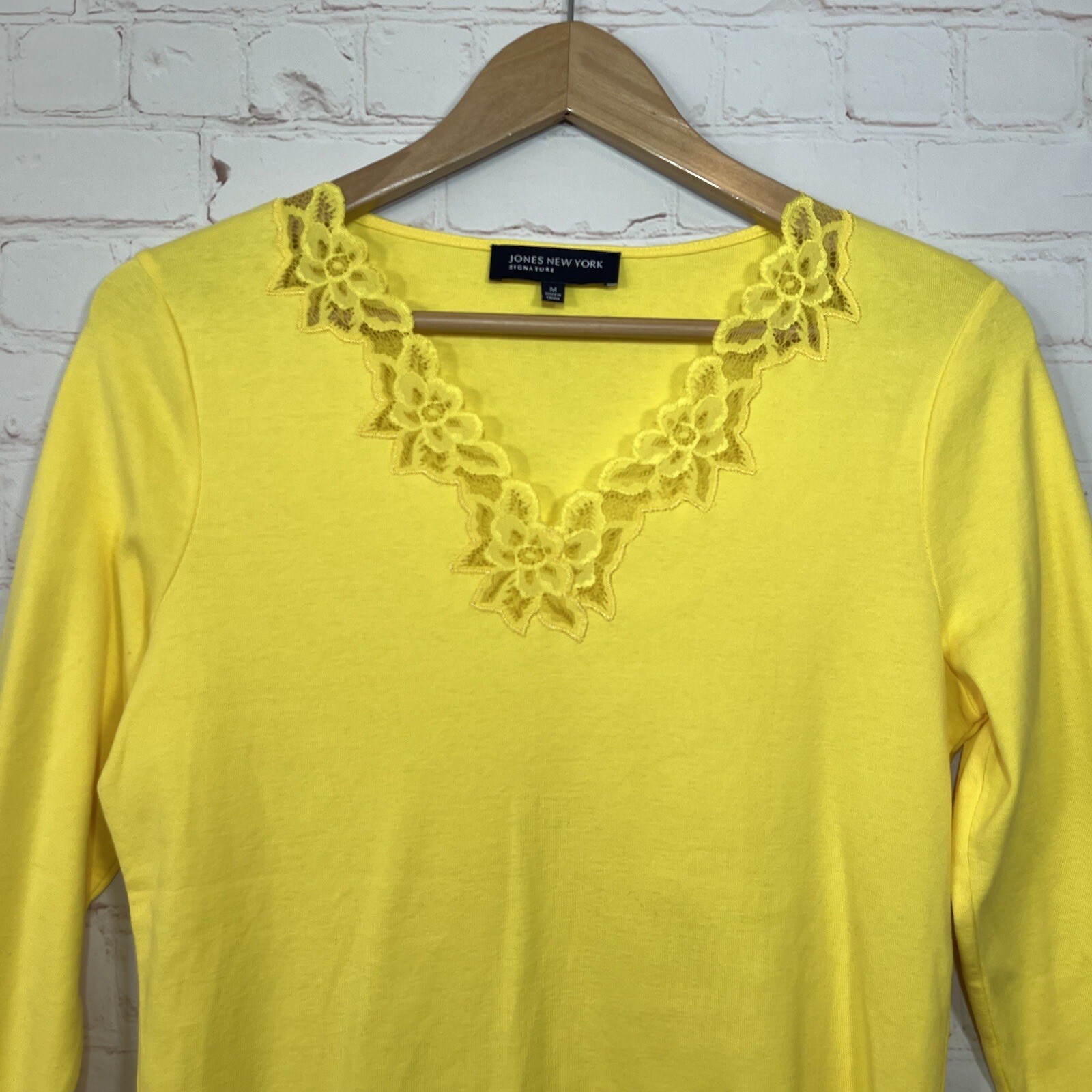 Jones New York Shirt Womens Medium Yellow Long Sleeve Lace V-Neck Cotton See measurements for accurate fit Shoulder to hem 24 inches Pit to Pit 17 inches All measurements are done flat lay