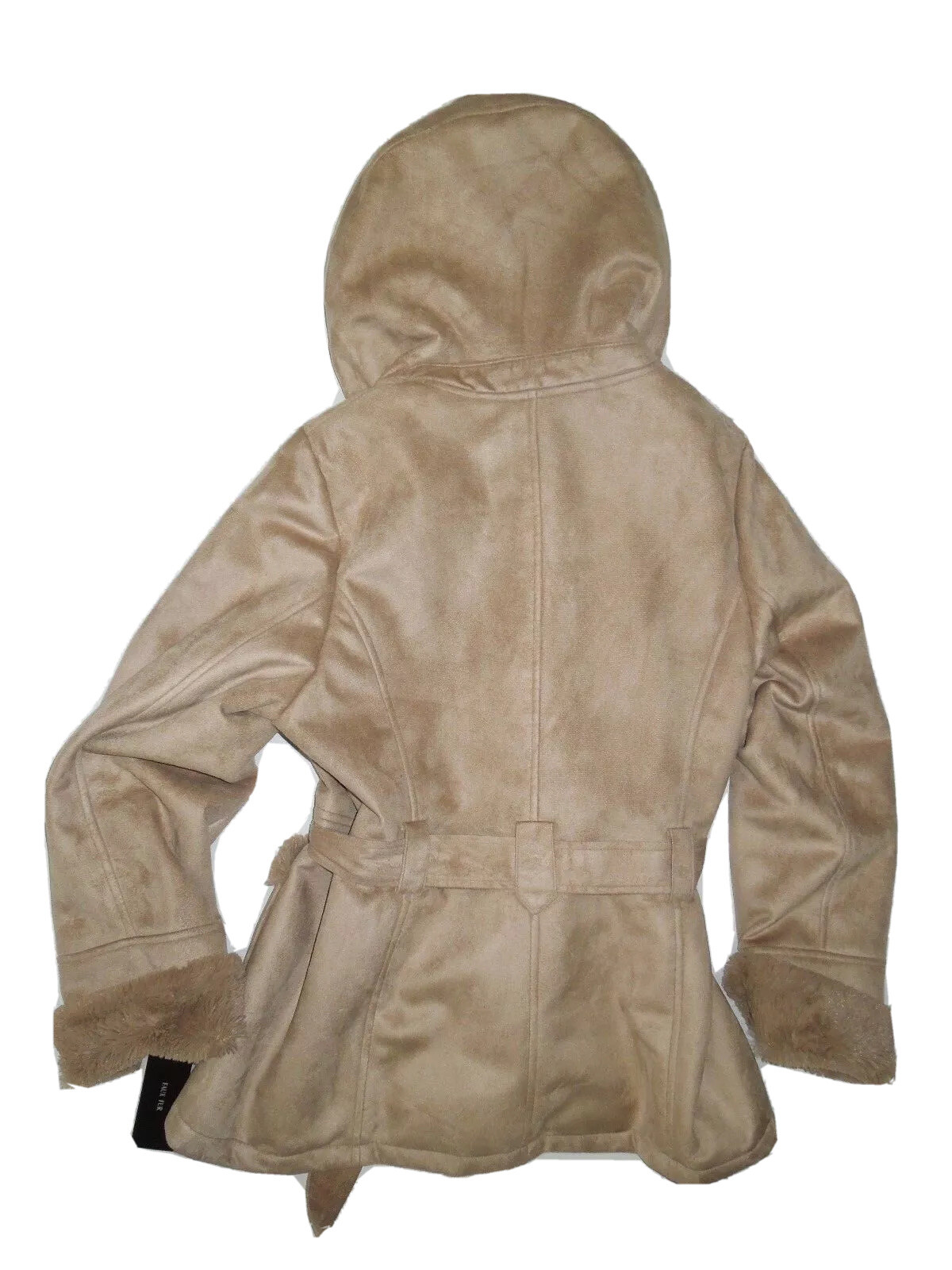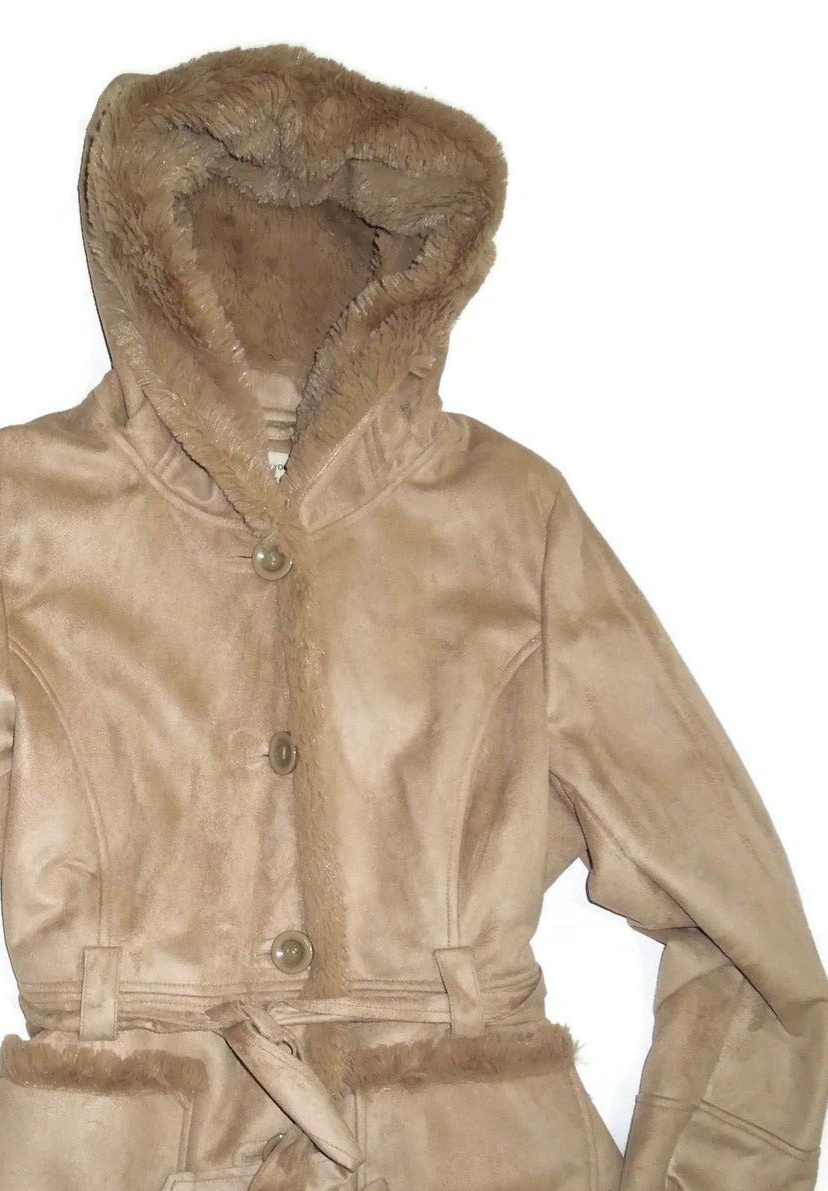 Jones New York Sport hooded Coat size: XL color: Camel faux shearling plush soft interior button and belted close polyester two front over-sized pockets Underarm to Underarm 23" Collar to bottom 29" R1025