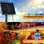 Features: Solar powered led light strings, low voltage power, non plug-in, no utility energy costs. Energy saving outdoor solar lights, high energy conservation rate. Lighting sensor technology: the string lights will light up automatically at dusk and automatically turns off at dawn. Specifications: LED color : Multi-color Setting: Outdoor LED Quantity: 200 LED Solar Panel: 2V/300mA Battery type: Rechargeable 1200mAH NI-MH Battery Light source: LED Switch: ON/OFF, MODE Working Modes: 8 Lighting Modes Charging time: 6-8 hours Total length: 72ft (22m) Length between 2 bulbs:3.9in(0.1m) Length from Solar panel to first LED: 6.5ft (2m) What's in the box? 2 x 200 LED Solar String Lights 2 x Solar Panel with Ground Stake 1 x User Manual NOTES 1.How to check the string lights work during Daytime? A.Completely cover the solar panel ,the String Lights will light up. B.If not ,Leave the solar Panel in the sun for an hour and then completely cover the solar panel again and it should light up. 2.Make sure that the solar panel is NOT sheltered from the sun, because it needs to absorb enough energy from the sun. 3. It is ONLY designed to be protected from the rain. Please do NOT immerse it in the water. 4. The solar string lights has memory function. It will return to your previous setting when you turn it off and turn it on again. 5. The solar panel is with light sensor feature ,so that it can automatically turn off at dawn and turn up at dusk. Solar Powered and Auto On/Off: These multicolor solar Christmas lights use solar energy, eliminating extra electricity costs and battery replacements. The light sensor charges the lights by day and turns them on automatically at night 8 Modes and Memory Function: Use the On/Off and mode buttons to select from 8 lighting modes. The built-in memory chip saves your last mode setting, so you don’t need to reset it daily Waterproof: With an IP65 rating, these solar Christmas lights are designed to withstand all weather conditions, including heavy rain and snow, making them suitable for indoor and outdoor use Easy to Install: 2 Pack ,each string 72 ft (including 6.5 ft lead cable) with a solar panel and ground stake is ideal for wrapping around trees or decorating various outdoor spaces. Ensure the solar panel is exposed to sunlight Widely Used Solar String Lights: These solar-powered string lights are perfect for Halloween, Christmas, weddings, holidays, gardens, yards, lawns, fences, porches, trees, roofs, and decks