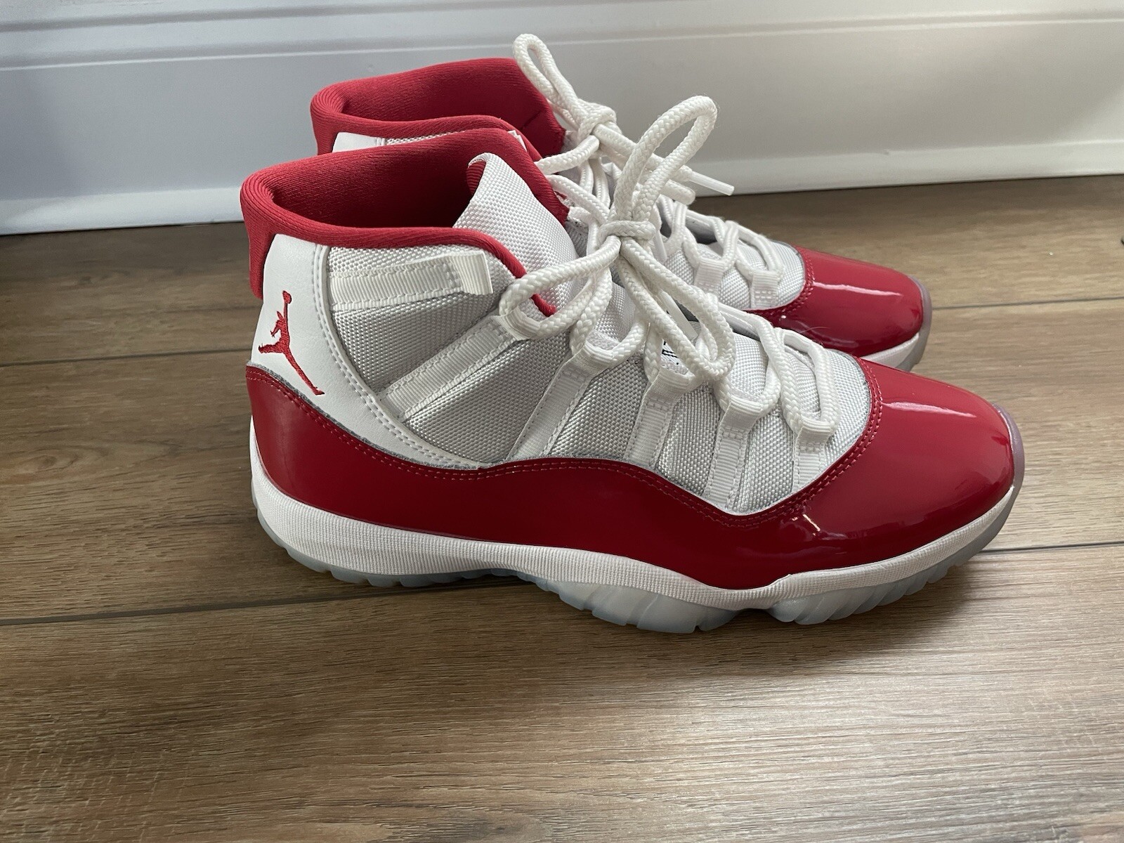 The Jordan 11 Cherry sneakers in size 9.5 feature a classic high-top style in a colorway of white, varsity red, and black. Part of the Air Jordan product line, this athletic shoe was released in 2022 and is identified by the style code CT8012-116. Known for its iconic design, the Air Jordan 11 model offers both style and performance for men who appreciate quality footwear.